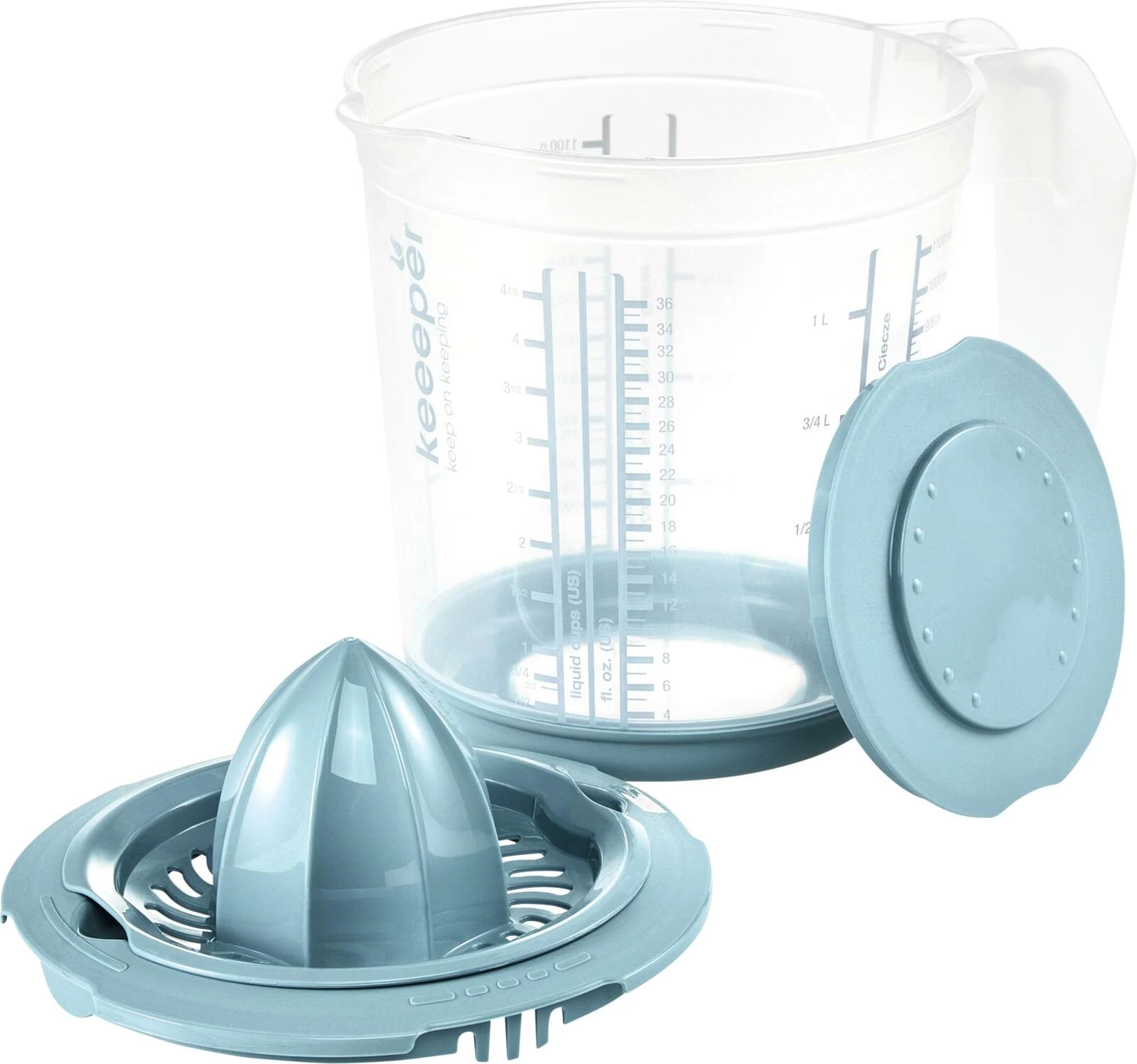 Mit Skalen für Flüssigkeiten, Mehl und Zucker sowie Cups und Fl. oz. Mit Spritzschutz, integrierter Zitruspresse, BPA-frei, robust und spülmaschinenfest.