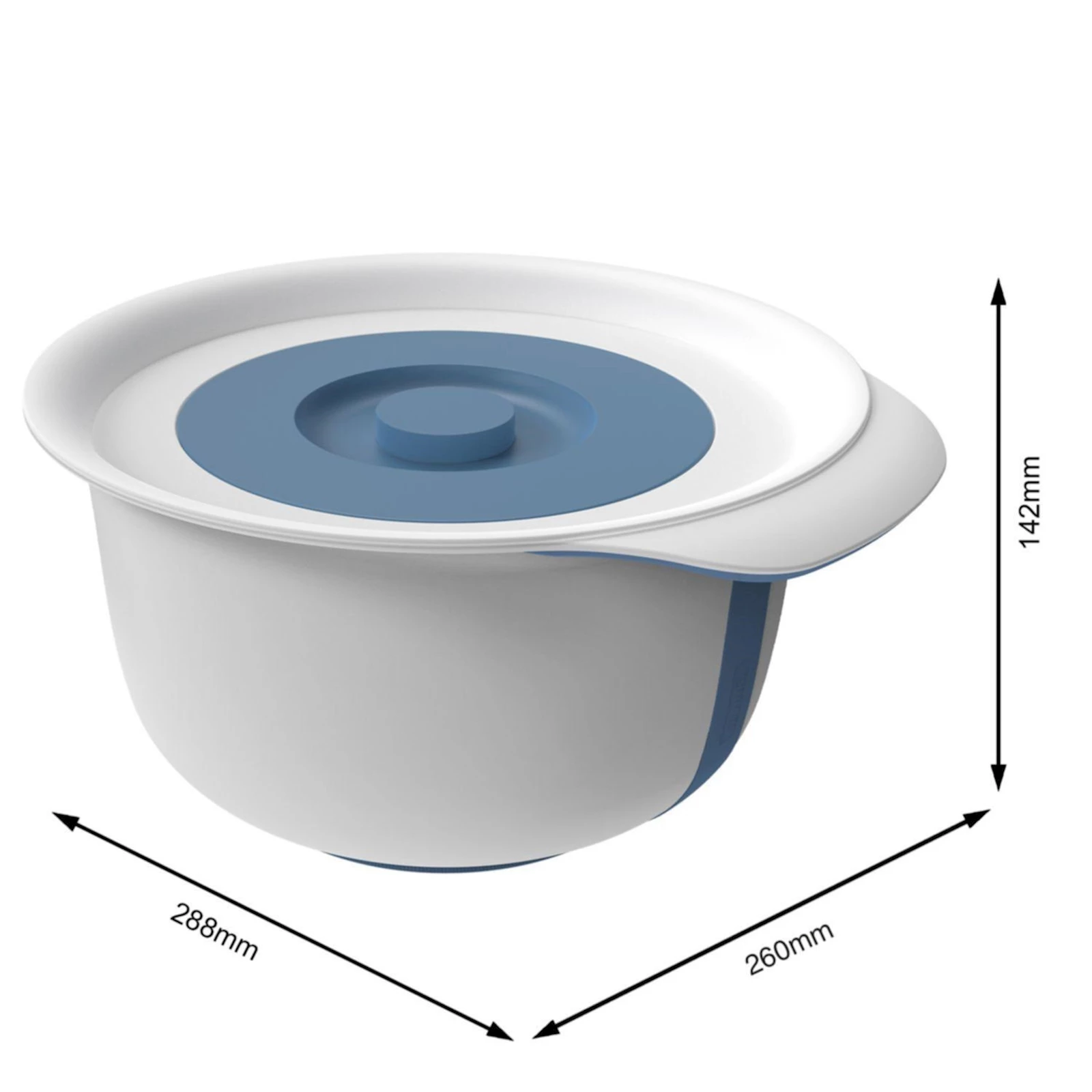 1,2 und 4 L Schüssel mit Griff, Spritzschutzring und Deckel. Rutschfester Boden, BPA-frei, stapelbar. Masse: 14,2 × 26 × 28,8 cm.