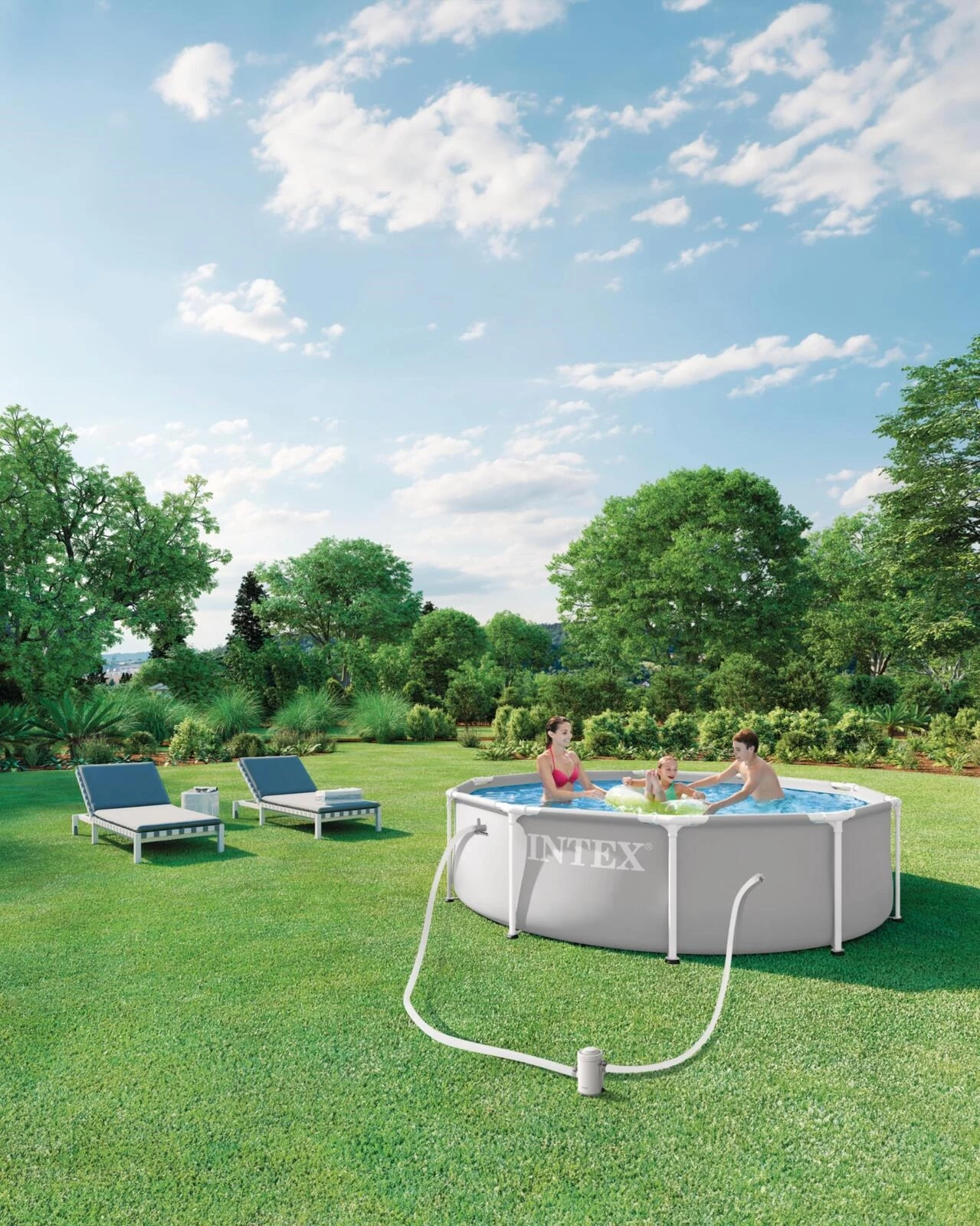 Der aufstellbare Pool inkl. Filterpumpe bietet ein tolles Badeerlebnis zu Hause. Dank dem Material aus PVC, PET und PP ist die Folie einfach in der Handhabung und kann leicht in Form gebracht werden. Die widerstandsfähigen Stangen aus Stahl sorgen für die nötige Stabilität. Das Füllvolumen beträgt: ca. 4'485 l. Um stets eine optimale Filtration zu gewährleisten, ist die Filterkartusche regelmässig auszuwechseln, bei starker Verschmutzung umgehend mit neuer Kartusche / Filter ersetzen.
