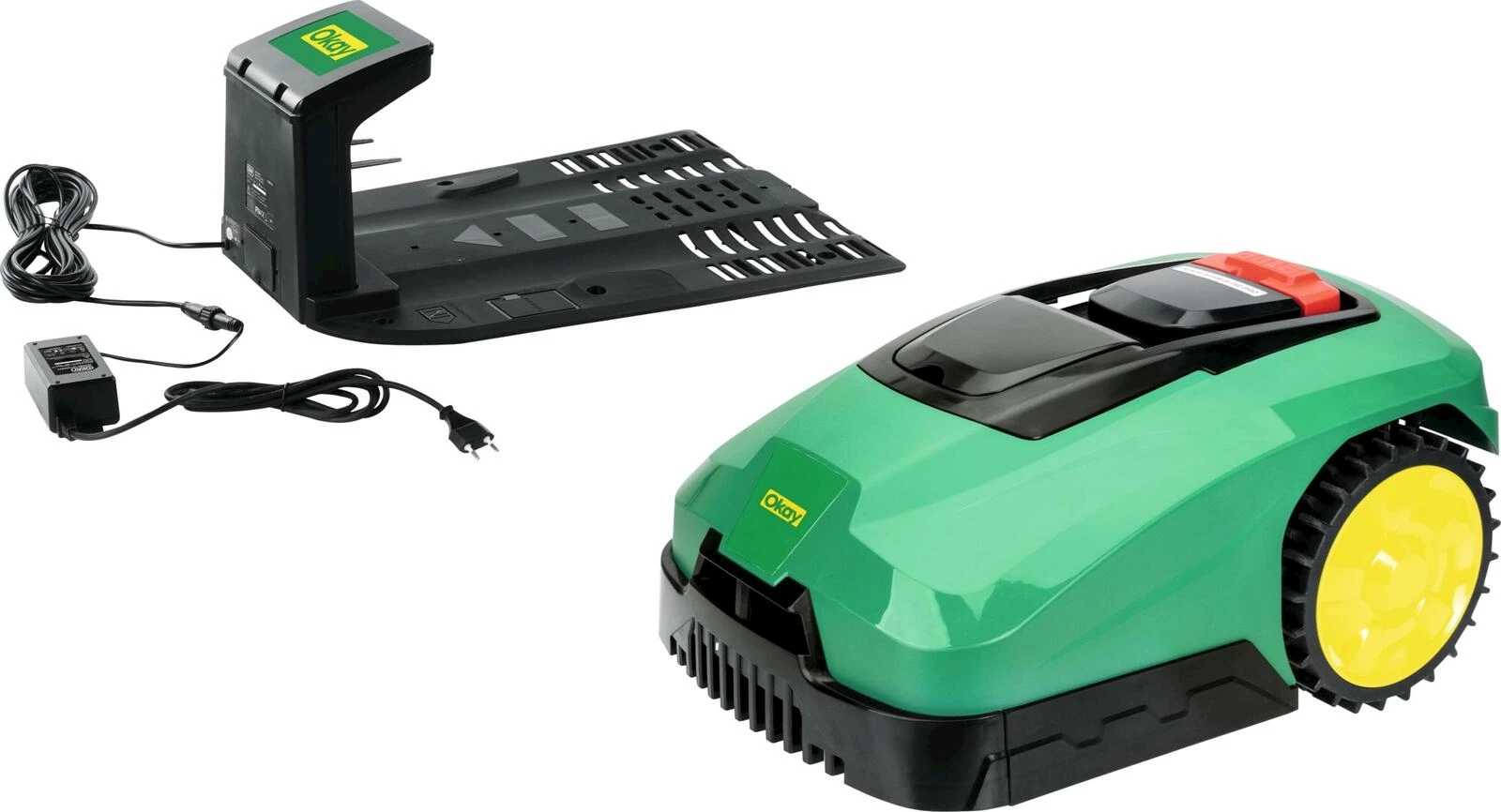 Okay. Multi-Zonen Programmierung. Regensensor. Mit Li-Ionen 28V/ 3 Ah Akku. Steigung bis 20°/35 %. Maximale Rasenfläche: 1200 m². Betriebszeit ca. 70 min. Inkl. Ladestation.