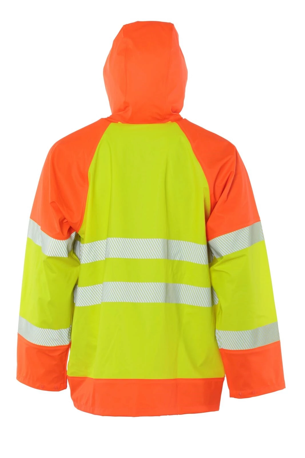 Wörker. Wasserdicht. Mit reflektierenden Leuchtstreifen. Wassersäule: 5000 mm. Material: PU und Polyester. EN471 Klasse 3. Farbe: Orange/gelb. Grössen: S - XXL.