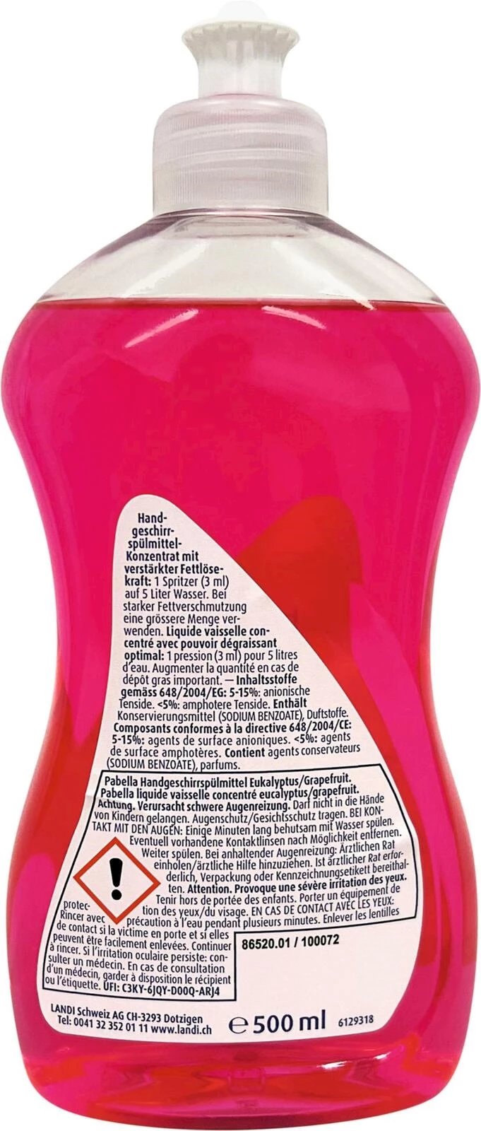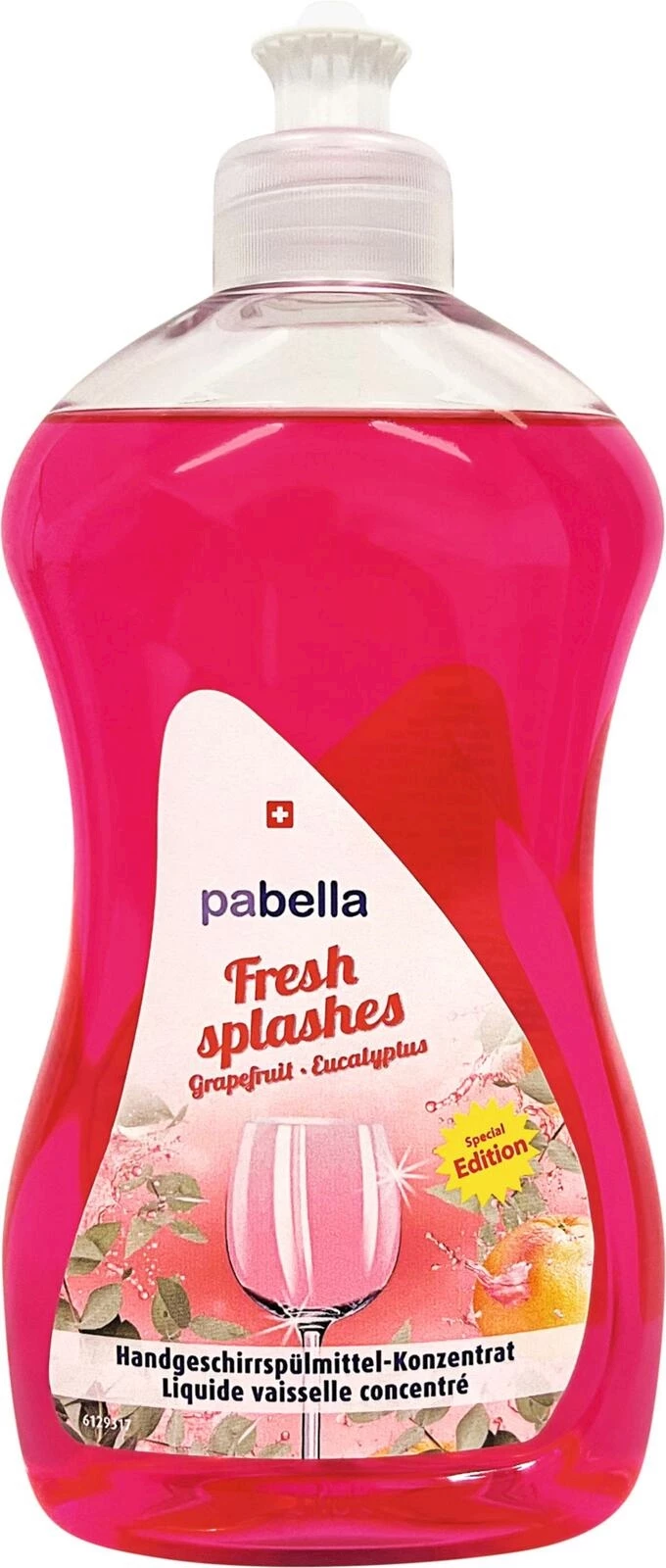 Das Handgeschirrspülmittel von pabella riecht angenehm nach Grapefruit, Eukalyptus und reinigt gründlich. Im Spülwasser löst sich das Spülmittel schnell auf und spaltet Fette effektiv. Durch den Dosierknopf oben am Deckel geht kein Tropfen verloren. Im Lieferumfang ist eine 500 ml Flasche enthalten.