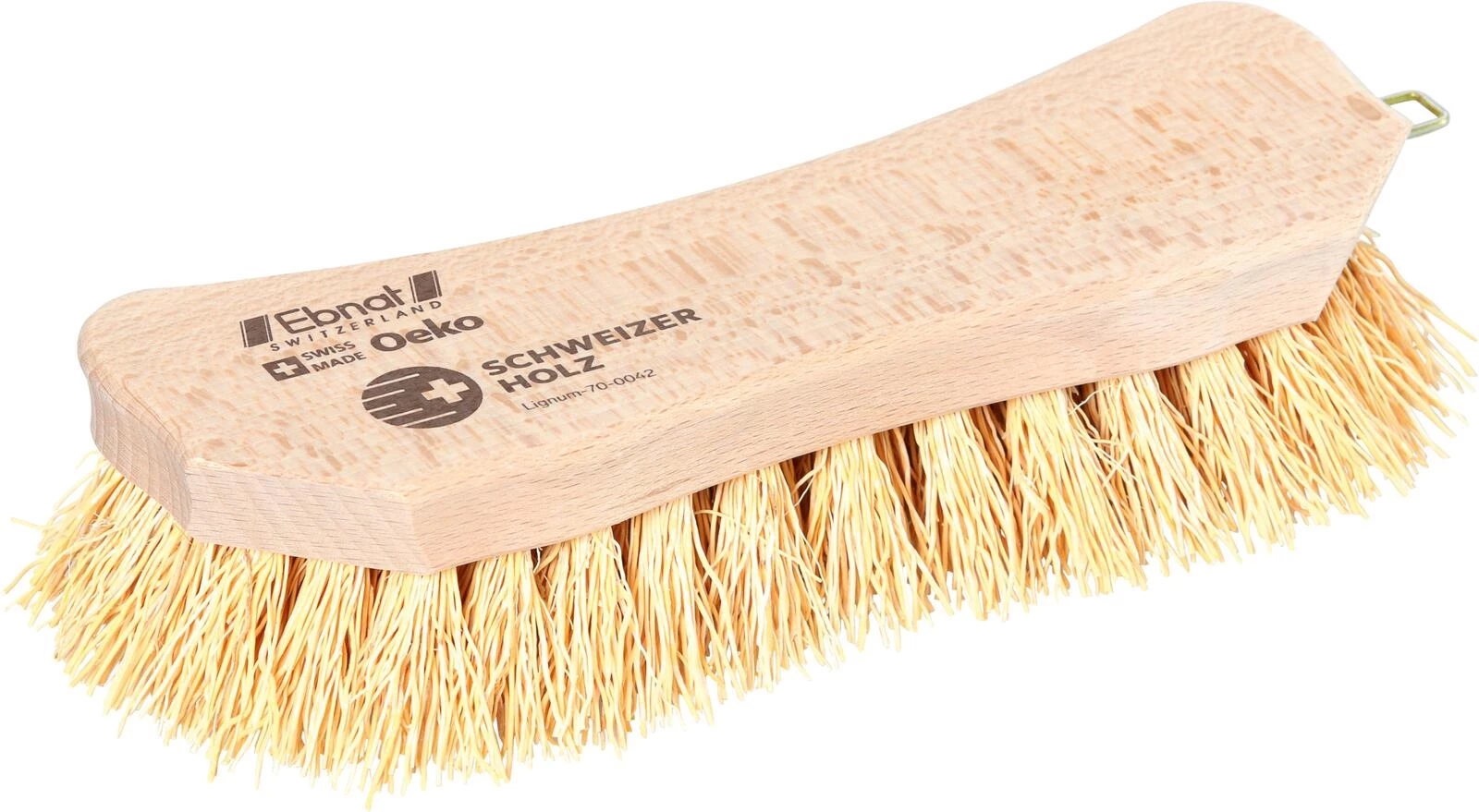 Die ergonomisch geformte Fegbürste in S-Form eignet sich für Links- und Rechtshänder. Ihr dichter Besatz aus widerstandsfähigem Union (Naturfaser-Mix) ist extra lang geschnitten und besonders robust. Die Bürste ist für die Nassreinigung konzipiert: Im Wasser quellen die Naturfasern auf, wodurch sie Schmutz noch effektiver lösen. Eine integrierte Kratzkante entfernt hartnäckige Verkrustungen. Der Buchenholzkörper misst 22 × 8 × 5 cm.