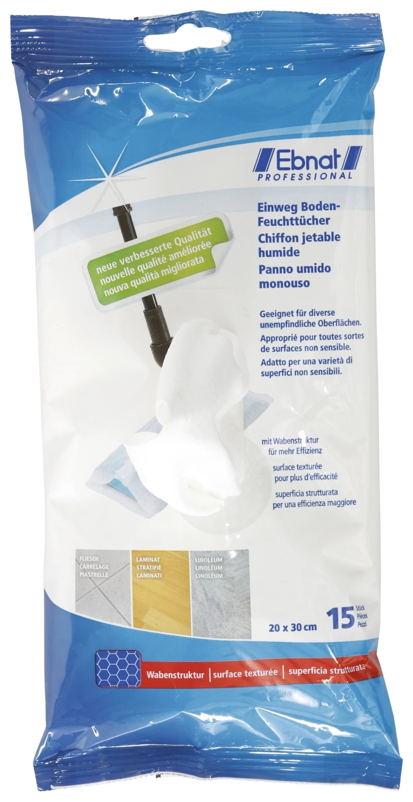 Die Feuchtigkeit wird durch die Struktur besser verteilt. Die Feuchttücher wirken antibakteriell und sind für diverse unempfindliche Oberflächen (Fliesen, Laminat, Linoleum) geeignet. Nicht geeignet für empfindliche Oberflächen wie Holz. Nicht auf Teppichen, Polster und Textilien verwenden. In einer Packung sind 15 Stück enthalten mit einer Grösse von je 28 × 22 cm.