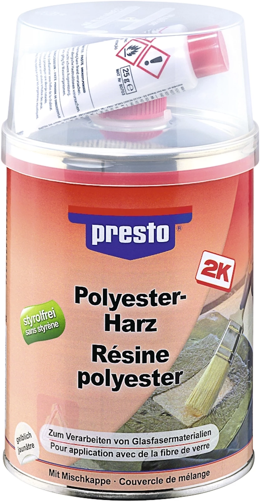 •Falls eine Lackierung der Fläche erfolgen soll, wird eine Weiterbehandlung mit presto plastic Füllspachtel oder presto flex Feinspachtel empfohlen. Die klebrig bleibende Oberfläche von Polyesterharz funktioniert dabei als optimale Haftvermittlung. Diese kann auf Wunsch jedoch auch mit Nitroverdünnung abgewaschen werden.
