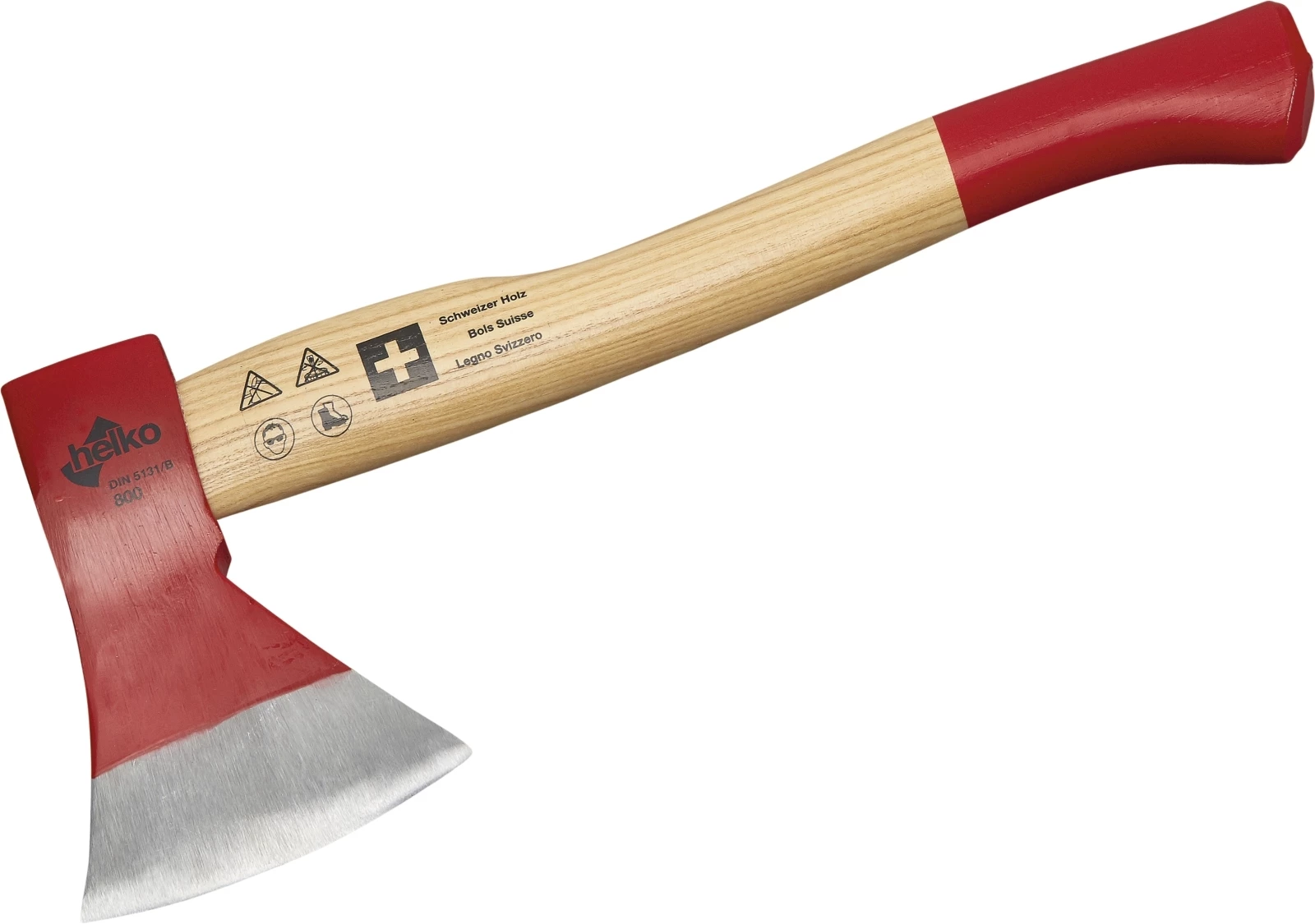 Stiel aus Schweizer Esche. Ein 38 cm langes rotes Beil, mit einem Gewicht von 800 g, das sich ideal für verschiedene Aufgaben eignet.