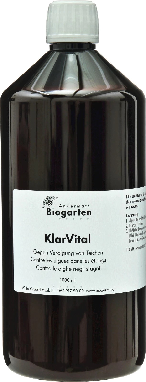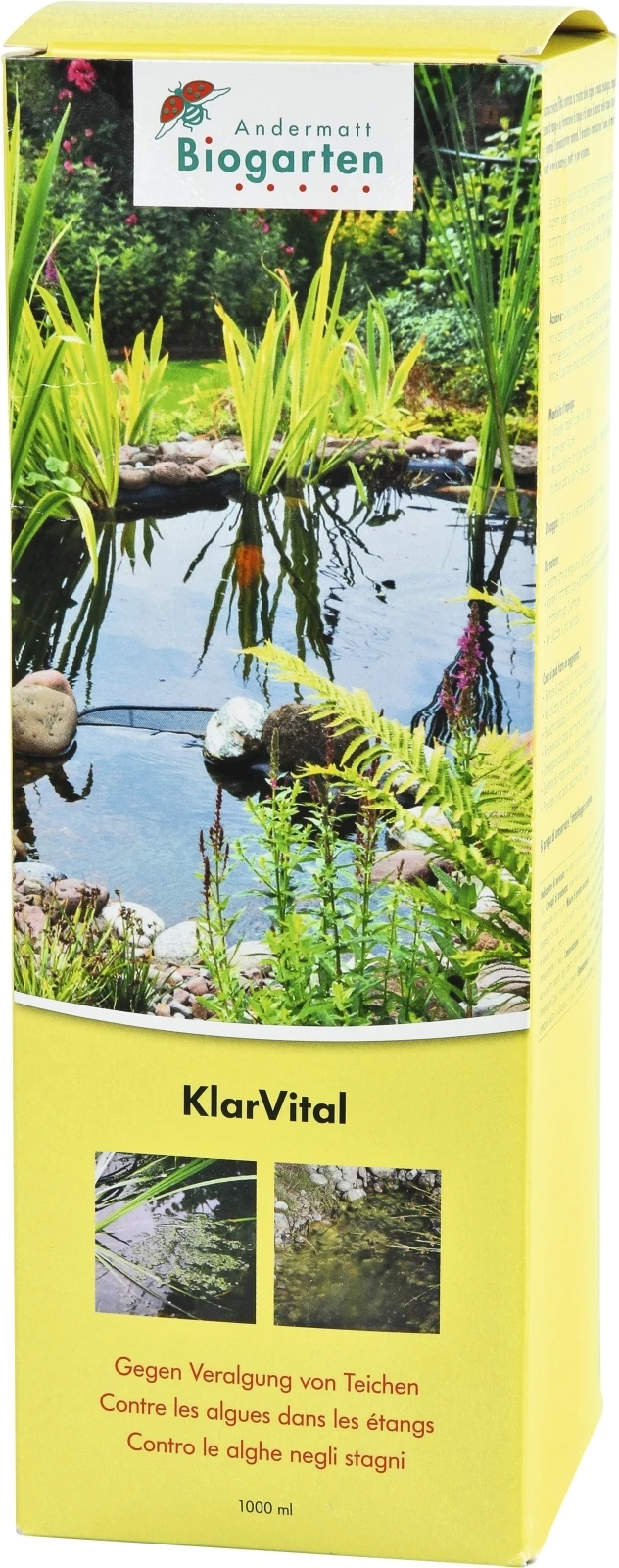 KlarVital wirkt biologisch gegen Algenwachstum und verhindert das Anfallen von Schlamm. Die enthaltenen lebenden Mikroorganismen, stark konzentriert, bauen organische Sedimente ab und binden überschüssige Nährstoffe, was das Algenwachstum hemmt. Das Produkt ist unschädlich für Menschen, Tiere (auch Fische und Insekten) und Pflanzen.
