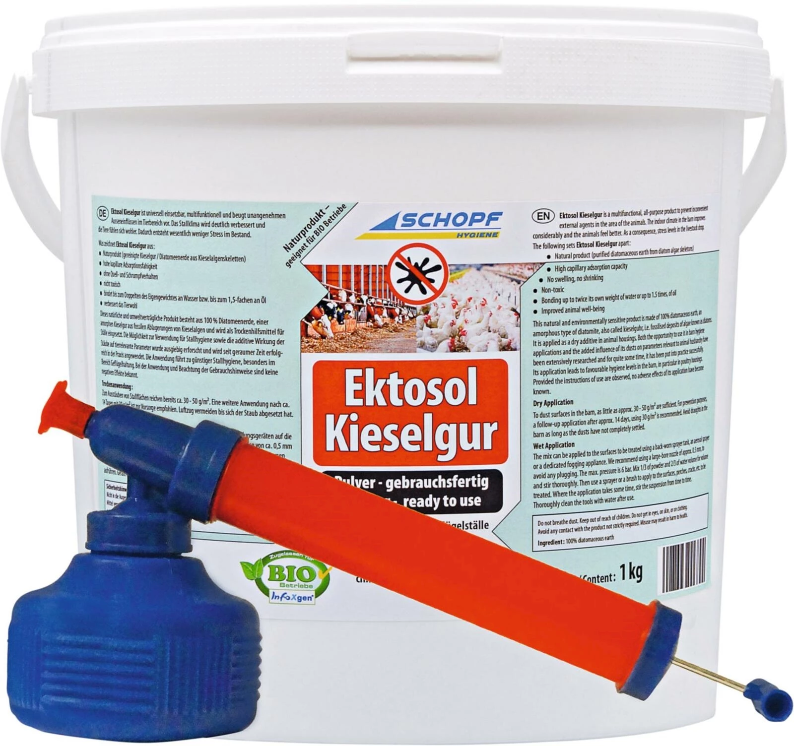 Bereits gebrauchsfertig. Es besteht aus 100 % Diatomeenerde aus Kieselalgenskeletten und ist ein Naturprodukt. Das feine Pulver, das meistens zerstäubt zum Einsatz kommt, besteht aus versteinerten Schalen fossiler Kieselalgen und verhindert zuverlässig die Milbenentwicklung. Das Stallklima wird dadurch deutlich verbessert und die Tiere fühlen sich wohler.