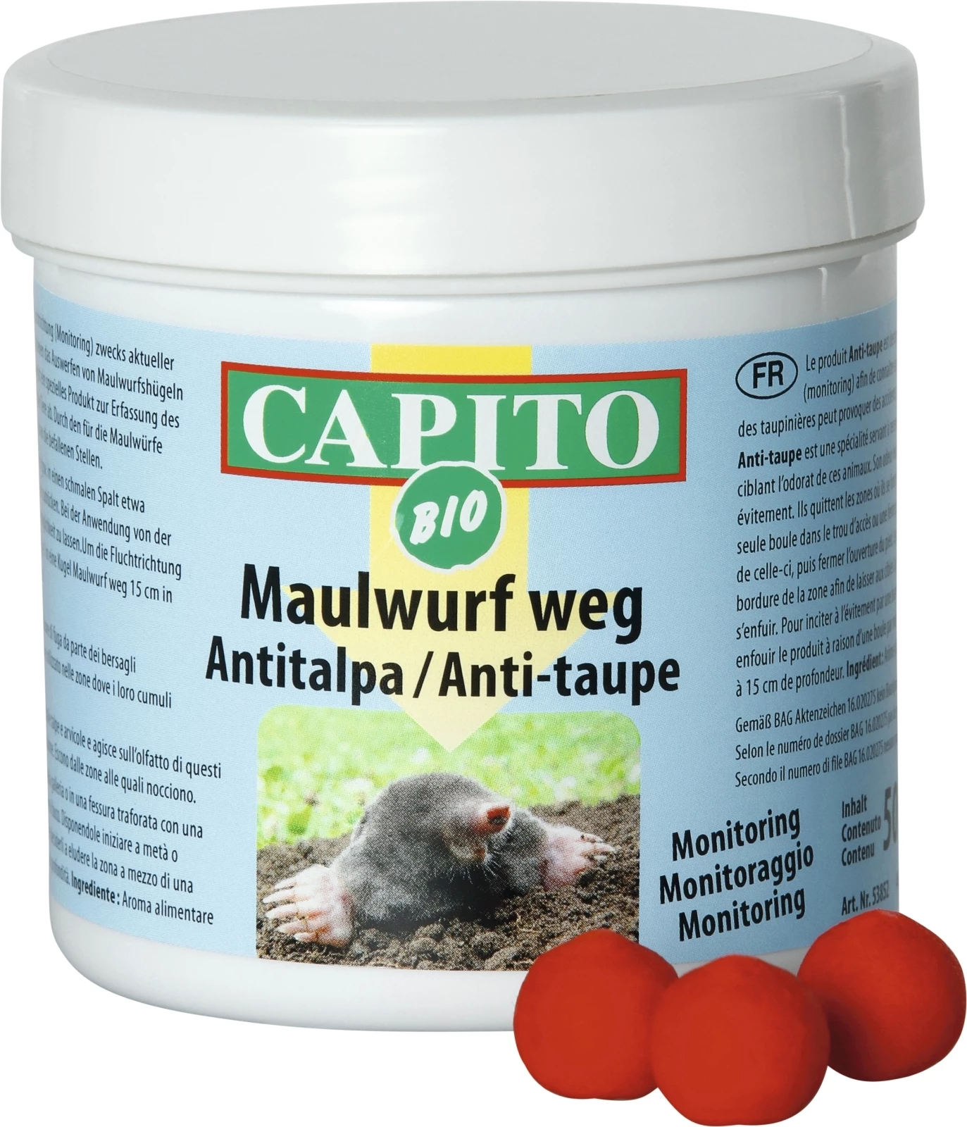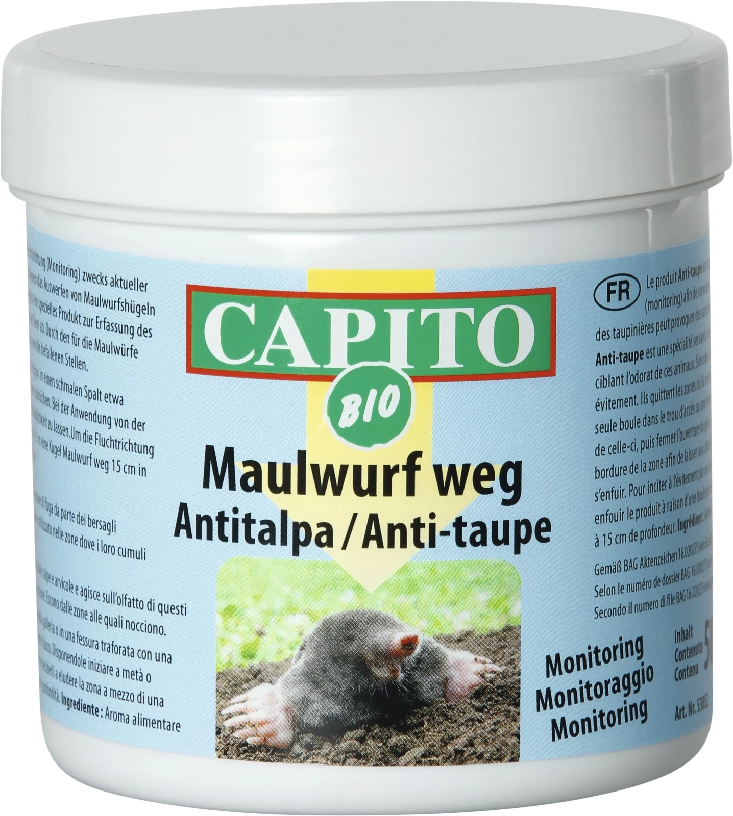 Spezielles Produkt zur Vertreibung von Maulwürfen und Wühlmäusen. Zielt auf den Geruchssinn der Tiere ab. Durch den für Nagetiere unerträglich Geruch verlassen die Tiere die präparierten Stellen.