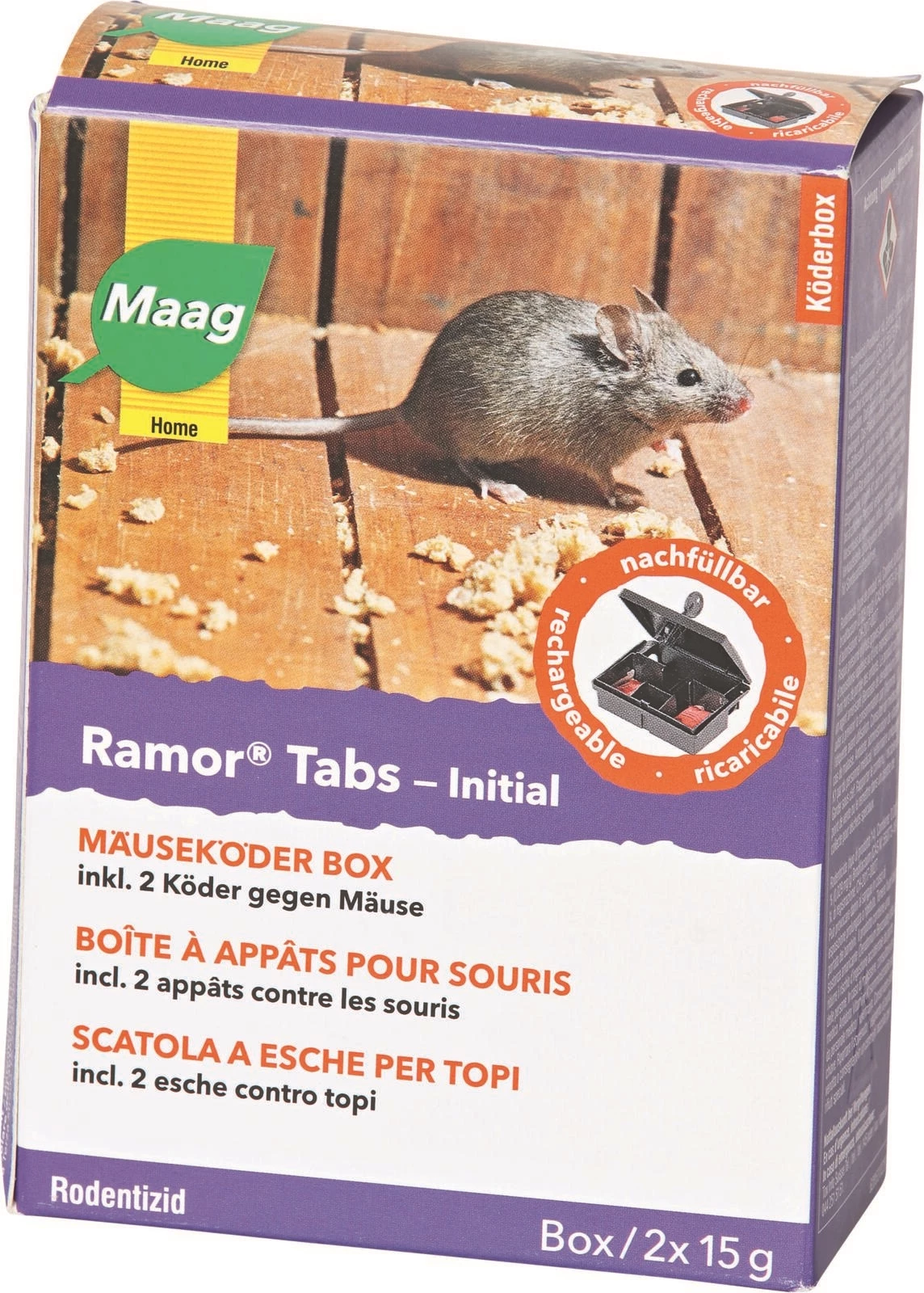 Die Ramor® Tabs - Mäuseköder Box enthält 2 sofort einsatzbereite Köder zur Bekämpfung von Mäusen in Gebäuden. Sie wirkt schnell und ist einfach zu nutzen.