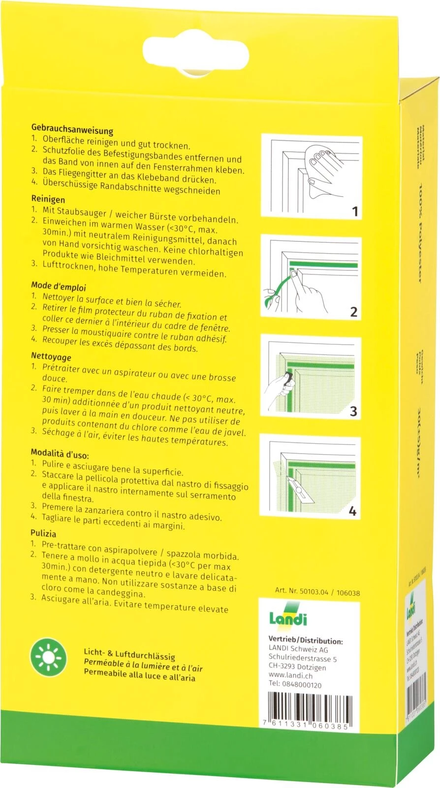Im Lieferumfang enthalten sind ca. 5,6 m Befestigungsband sowie ein Presswerkzeug zum sauberen Andrücken. Je nach Fenster- oder Türrahmen dauert die Montage eines Paneels etwa 20 Minuten. Bei Bedarf lässt sich das Netz wieder rückstandslos entfernen.
