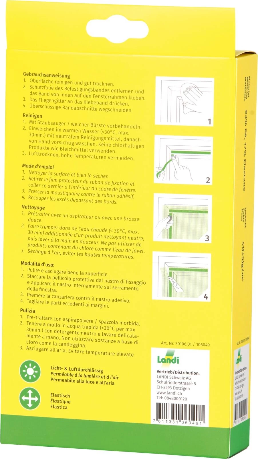 Untergrund vor der Montage gründlich reinigen und trocknen. Dank der elastischen Struktur lässt sich das Netz besonders gut anpassen und faltenfrei anbringen. Staub regelmässig entfernen und bei Bedarf feucht reinigen.