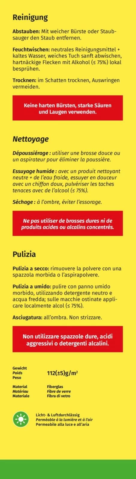 Das Material ist UV-beständig, formstabil und leicht zu reinigen. Es eignet sich auch für Haushalte mit Haustieren, solange starke mechanische Belastungen vermieden werden.