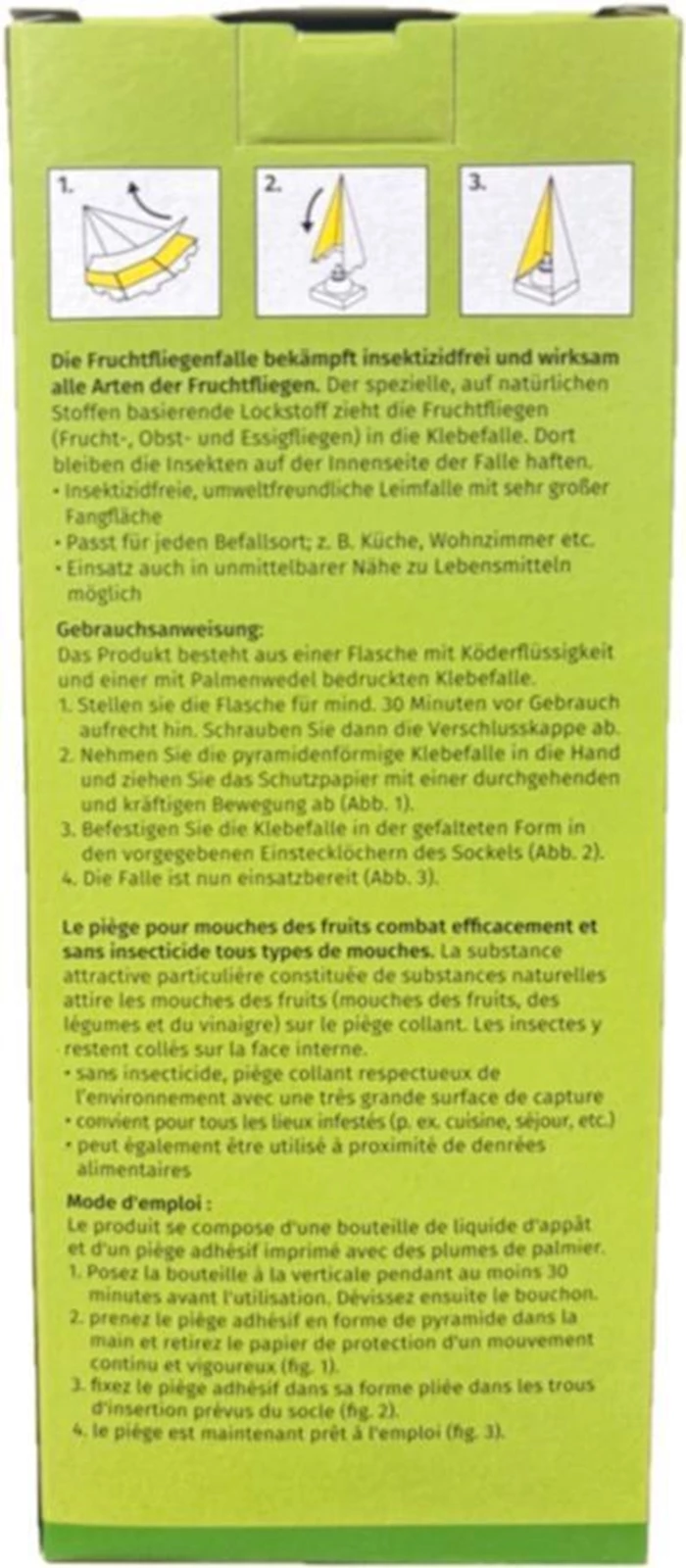 Die Fruchtfliegenfalle bekämpft insektizidfrei und wirksam alle Arten von Fruchtfliegen. Der spezielle, auf natürlichen Stoffen basierende Lockstoff zieht die Fruchtfliegen (Frucht-, Obst- und Essigfliegen) in die Klebefalle. Dort bleiben die Fruchtfliegen auf der Innenseite haften.