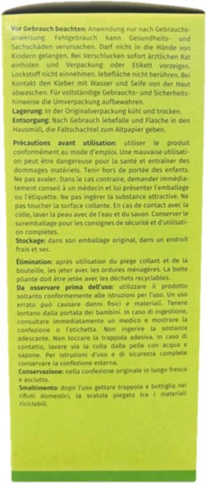 Insektizidfreie, umweltfreundliche Fruchtfliegenfalle mit sehr grosser Fangfläche. Passt für jeden Befallsort. Einsatz auch in unmittelbarer Nähe zu Lebensmitteln möglich.