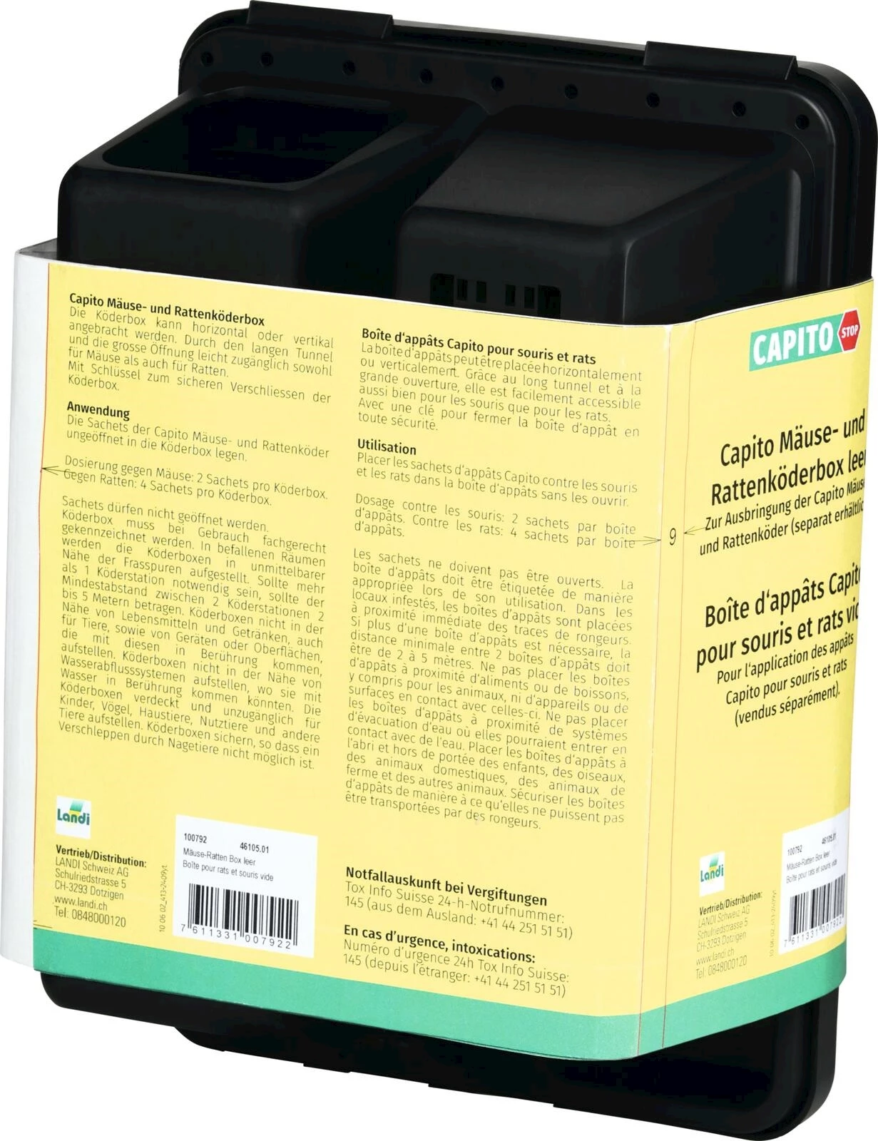 Capito. Eignet sich für Köder 51541 und 51115 (separat erhältlich) und bietet zuverlässigen Schutz sowie einfache Handhabung in befallenen Bereichen. Weitere Informationen zum Thema Schadnager finden Sie auf dem [STS Merkblatt «Bekämpfung von Schaden verursachenden Nagern»|https://www.landi.ch/media/f7f343fd-529e-4c8b-bc05-08198f877c6b/1P0J8Q/Bilder/Laden/Aktuell/Themen/STS/Merkblatt_Schadnager.pdf].