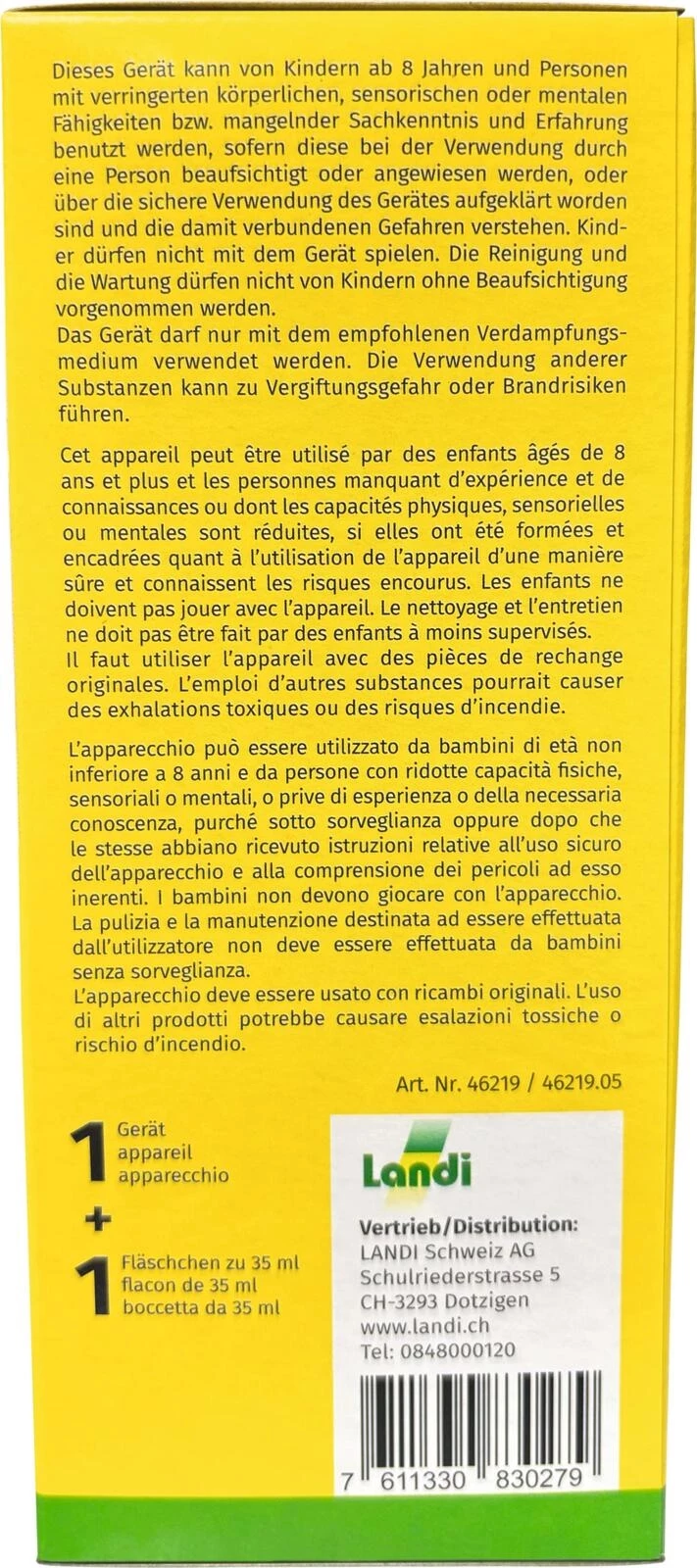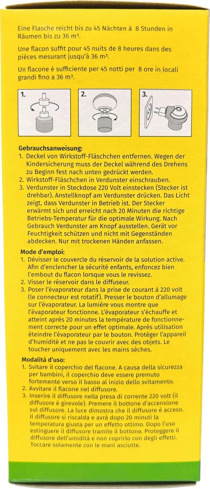 Bietet zuverlässigen Schutz gegen Mücken und andere Insekten. Wirkt auch bei offenen Fenstern. Geruchlos. 1 Flasche (35 ml) wirkt ca. 45 Nächte à ca. 8 Stunden in Räumen mit bis zu 36m3. Gerät vor Feuchtigkeit schützen. Nur mit trockenen Händen anfassen.