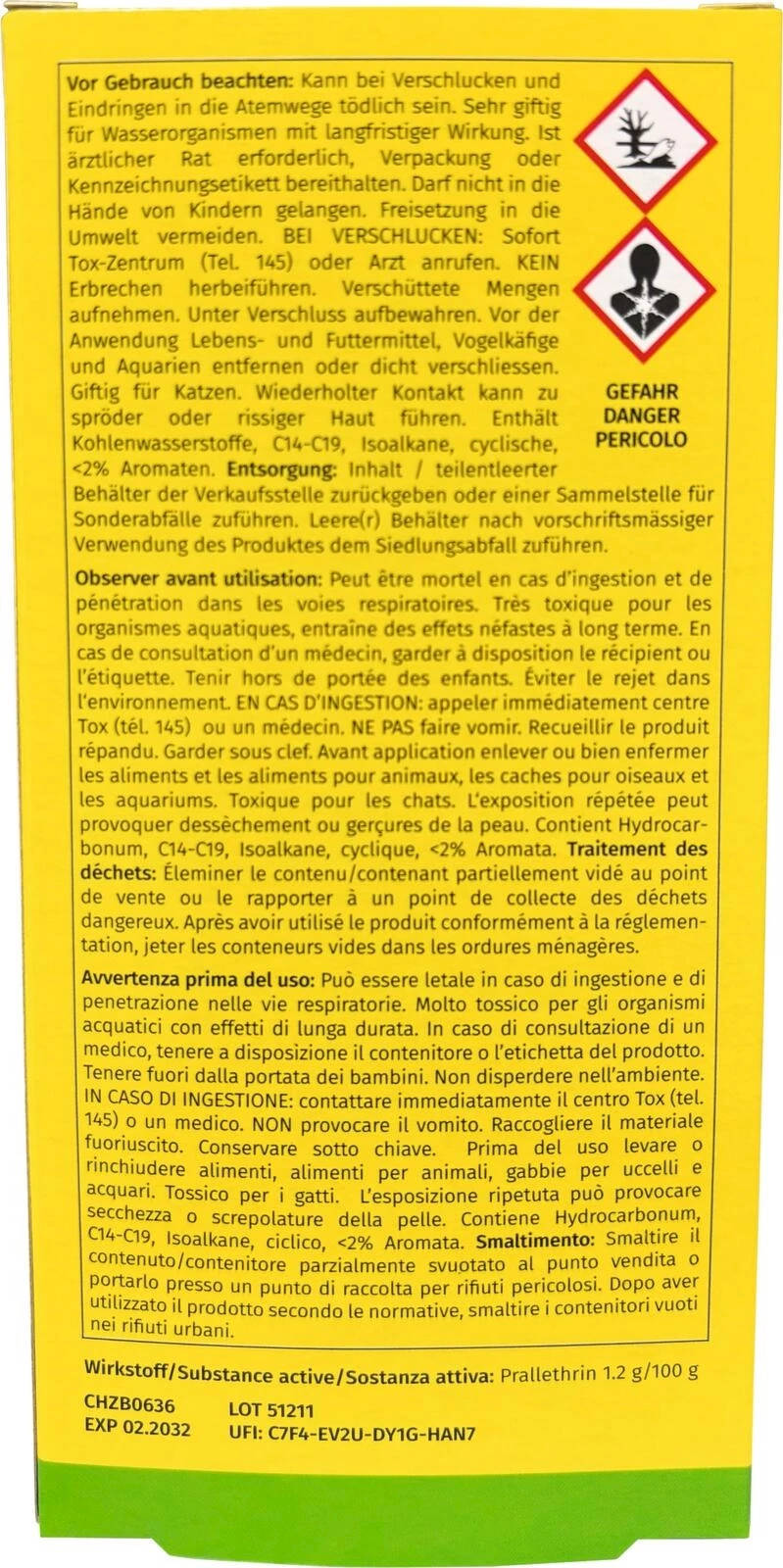 Bei verschlucken: Sofort Tox-Zentrum (Tel. 145) oder Artz anrufen. Kein Erbrechen herbeiführen. Verschütte Menge aufnehmen. Vor der Anwendung Lebens-und Futtermittel, Vogelkäfige und Aquarien entfernen oder dicht verschliessen. Giftig für Katzen. Wiederholter Kontakt kann zu spröder oder rissiger Haut führen. Enthält Kohlenwasserstoffe, C14-C19, Isoalkane, cyclische, <2% Aromaten.
