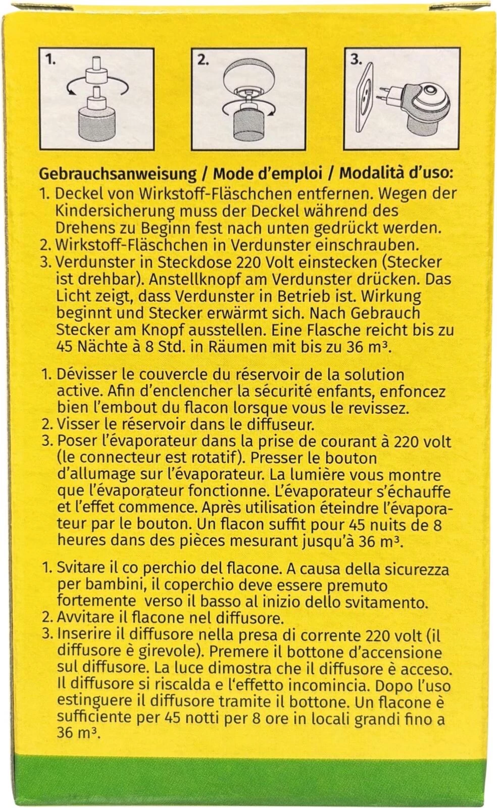 Bietet zuverlässigen Schutz gegen Mücken und andere Insekten. Geruchlos.1 Flasche: 35 ml wirkt ca. 45 Nächte.