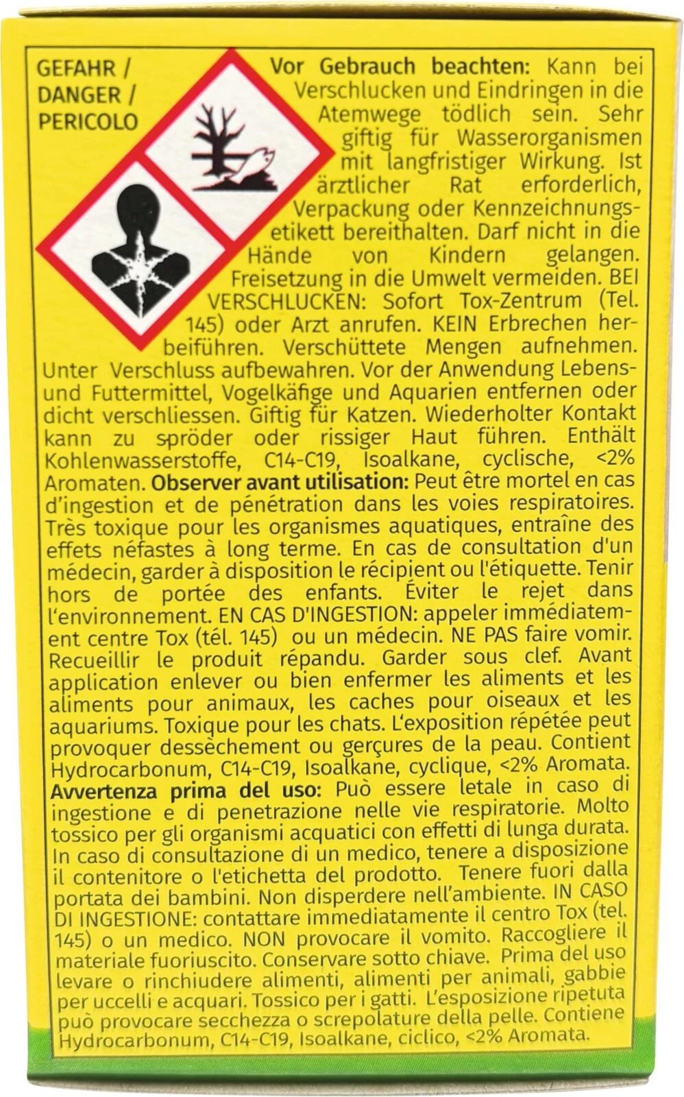 Bei verschlucken: Sofort Tox-Zentrum (Tel. 145) oder Artz anrufen. Kein Erbrechen herbeiführen. Verschütte Menge aufnehmen. Vor der Anwendung Lebens-und Futtermittel, Vogelkäfige und Aquarien entfernen oder dicht verschliessen. Giftig für Katzen. Wiederholter Kontakt kann zu spröder oder rissiger Haut führen. Enthält Kohlenwasserstoffe, C14-C19, Isoalkane, cyclische, <2% Aromaten.