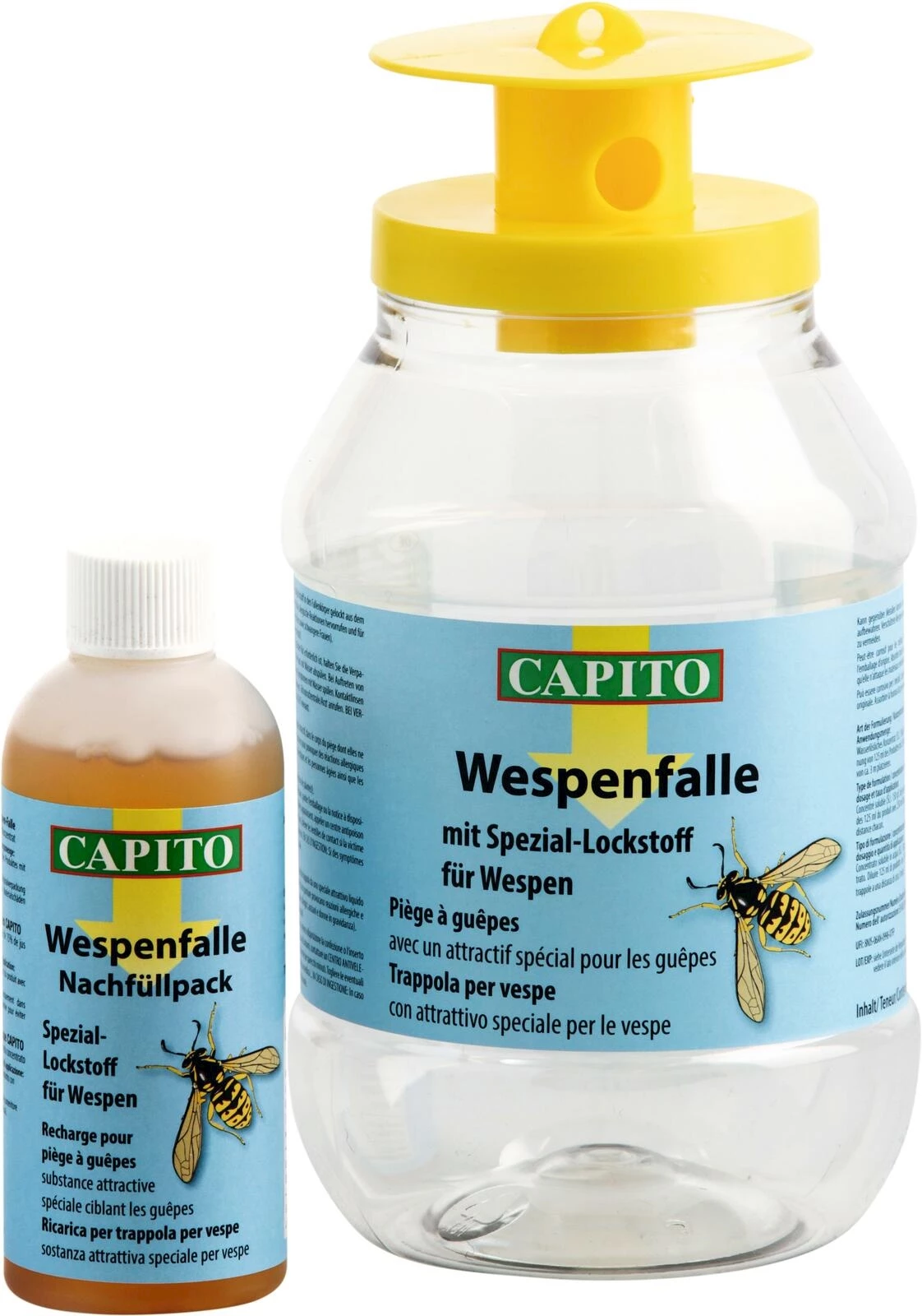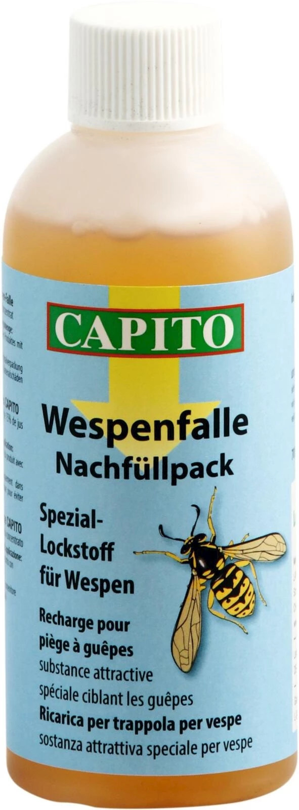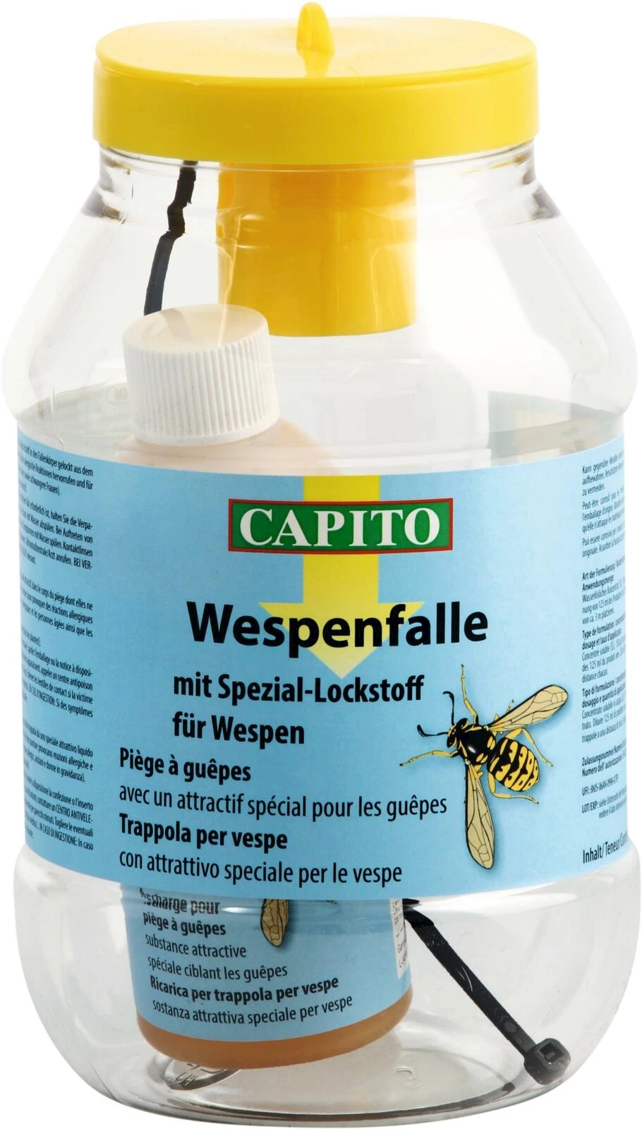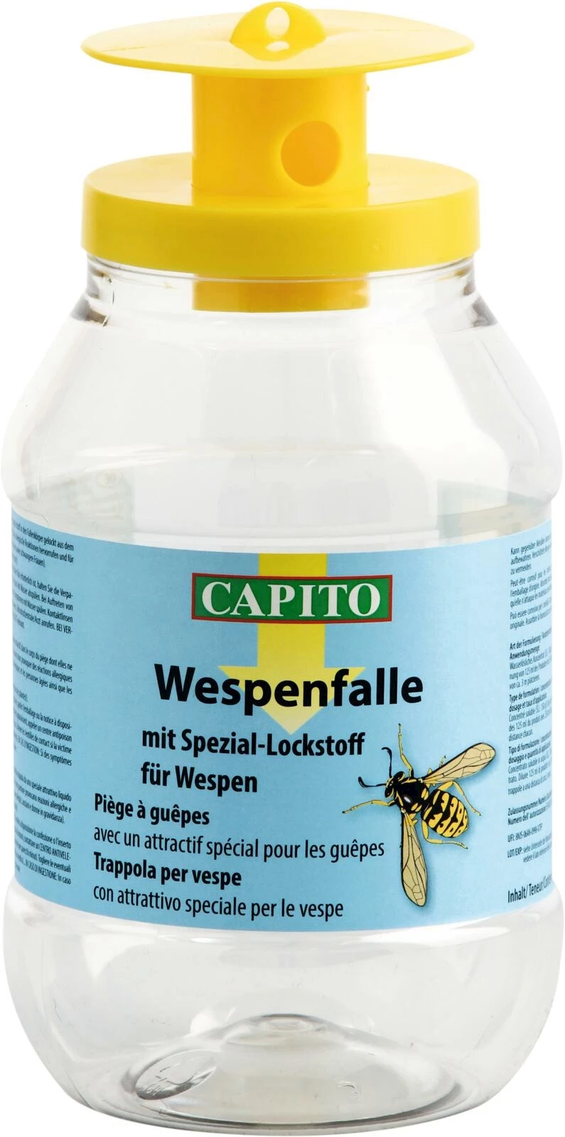 Die Wespenfalle mit Lockstoff von Capito lockt Wespen an. Durch eine Öffnung in der Falle gelangen die Wespen in die Falle und kommen anschliessend nicht mehr frei. Die Falle dient zum Monitoring der Befallsermittlung.