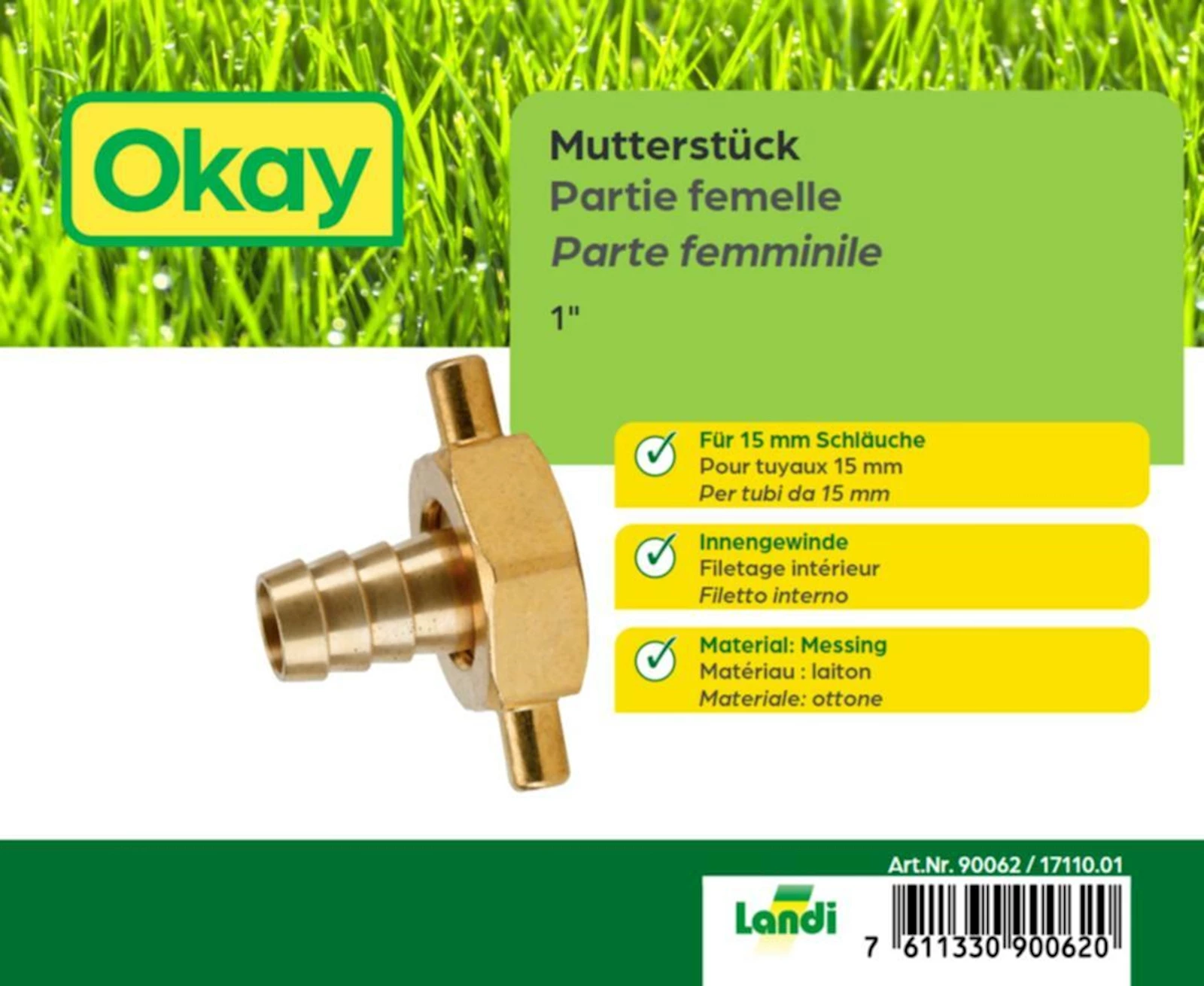 Mutterstück Okay 1" 16 mm ist mit einem 1" Innengewinde ausgestattet. Es wird für 5/8" (15 mm) Schläuche verwendet. Dieses Mutterstück aus Messing dient zum einfachen Anschliessen eines Wasser-/Gartenschlauchs am Wasserhahn. Für optimalen Halt wird der Schlauch zusätzlich mit einer Schlauchbride (optinal erhältlich) befestigt.