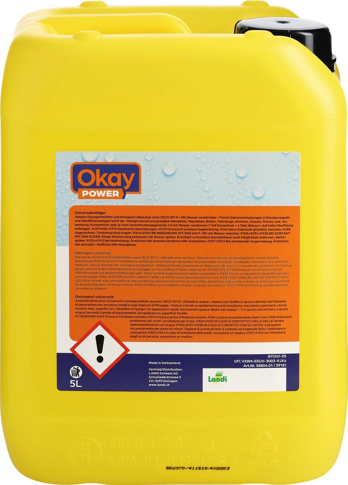 Okay Power Universalreiniger. Absolut lösungsmittelfrei und biologisch abbaubar nach OECD 301 E. Mit Wasser verdünnbar. Trennt Ölverschmutzungen in Emulsionsspalt- und Ultrafiltrieranlagen. Reinigt schnell und gründlich Metallteile, Maschinen, Böden, Fahrzeuge, Motoren, Chassis, Planen usw.