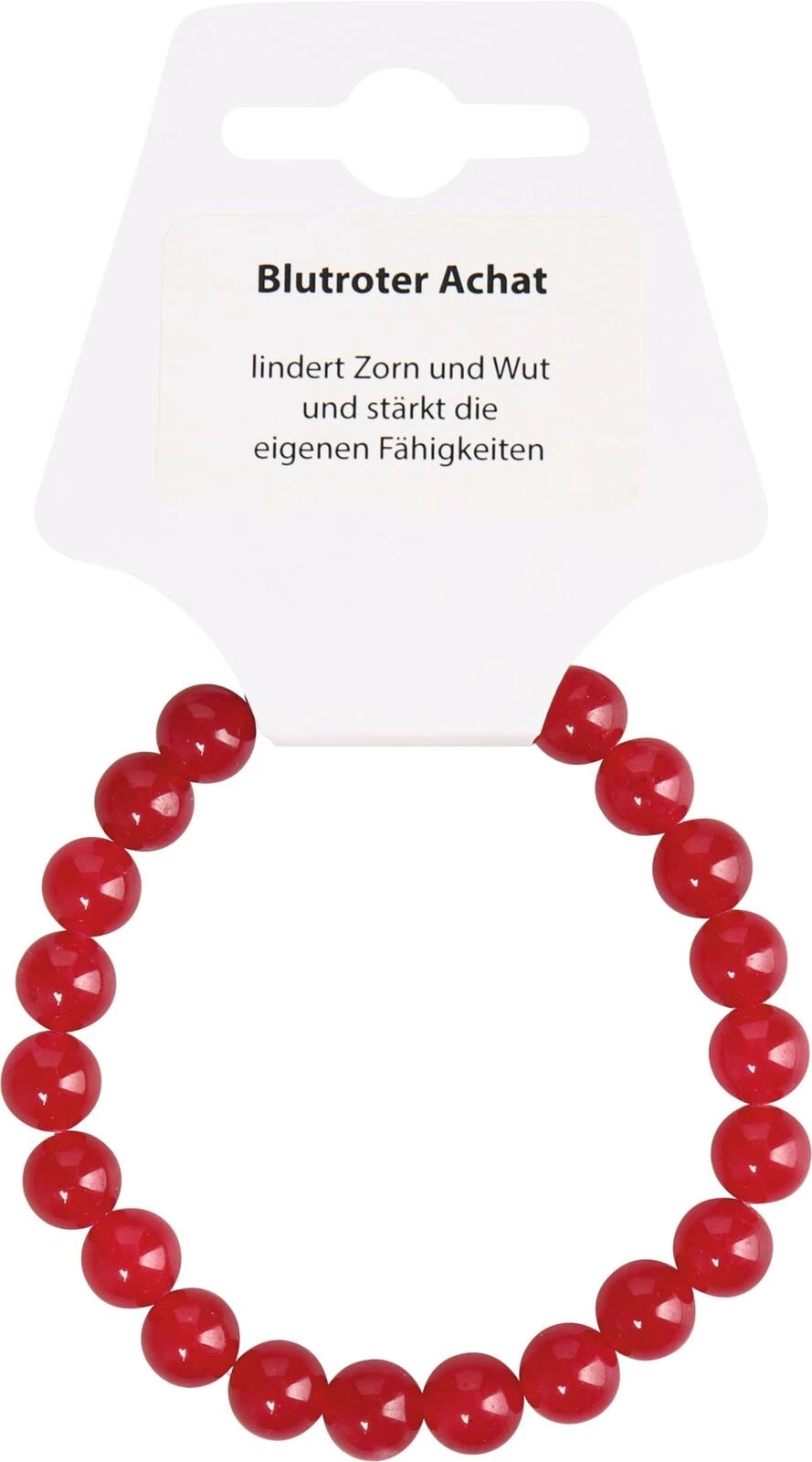 Das Steinarmband Blutroter Achat ist ein stilvolles Accessoire aus hochwertigen, ca. 8 mm grossen roten Achat-Perlen. Es ist auf einem elastischen Band gefädelt, wodurch es sich flexibel an jedes Handgelenk anpasst. Der blutrote Achat ist nicht nur optisch ein Blickfang, sondern bietet auch wohltuende Eigenschaften: Er hilft dabei, Zorn und Wut zu lindern und stärkt die eigenen Fähigkeiten.
