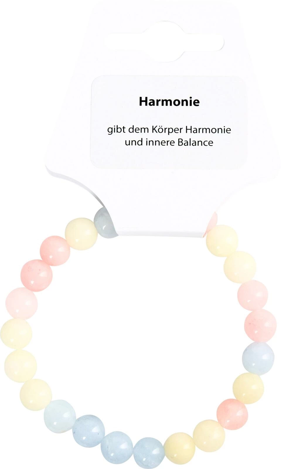 Das schöne Steinarmband (Harmonie) aus verschiedenen Achaten hat ca. 8 mm grosse Steinperlen. Die Steine sind auf ein elastisches Band aufgezogen, was die Armbänder für jedes Handgelenk anpassbar macht.