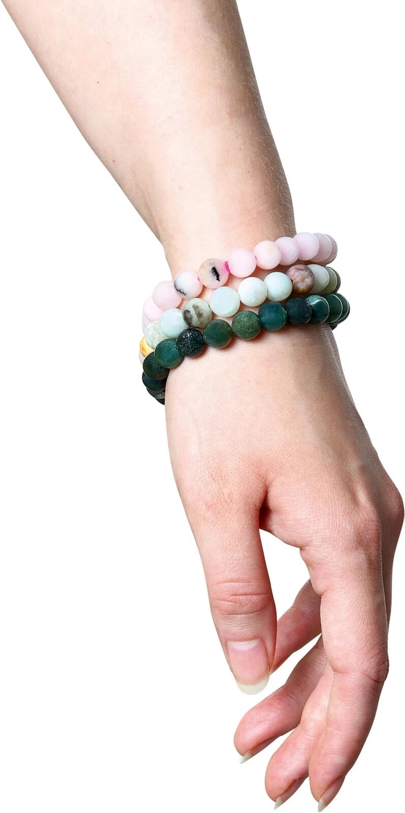 Das schöne Perlenarmband hat ca. 8 mm grosse Steinperlen. Die Steine sind auf ein elastisches Band aufgezogen, was die Armbänder für jedes Handgelenk anpassbar macht.