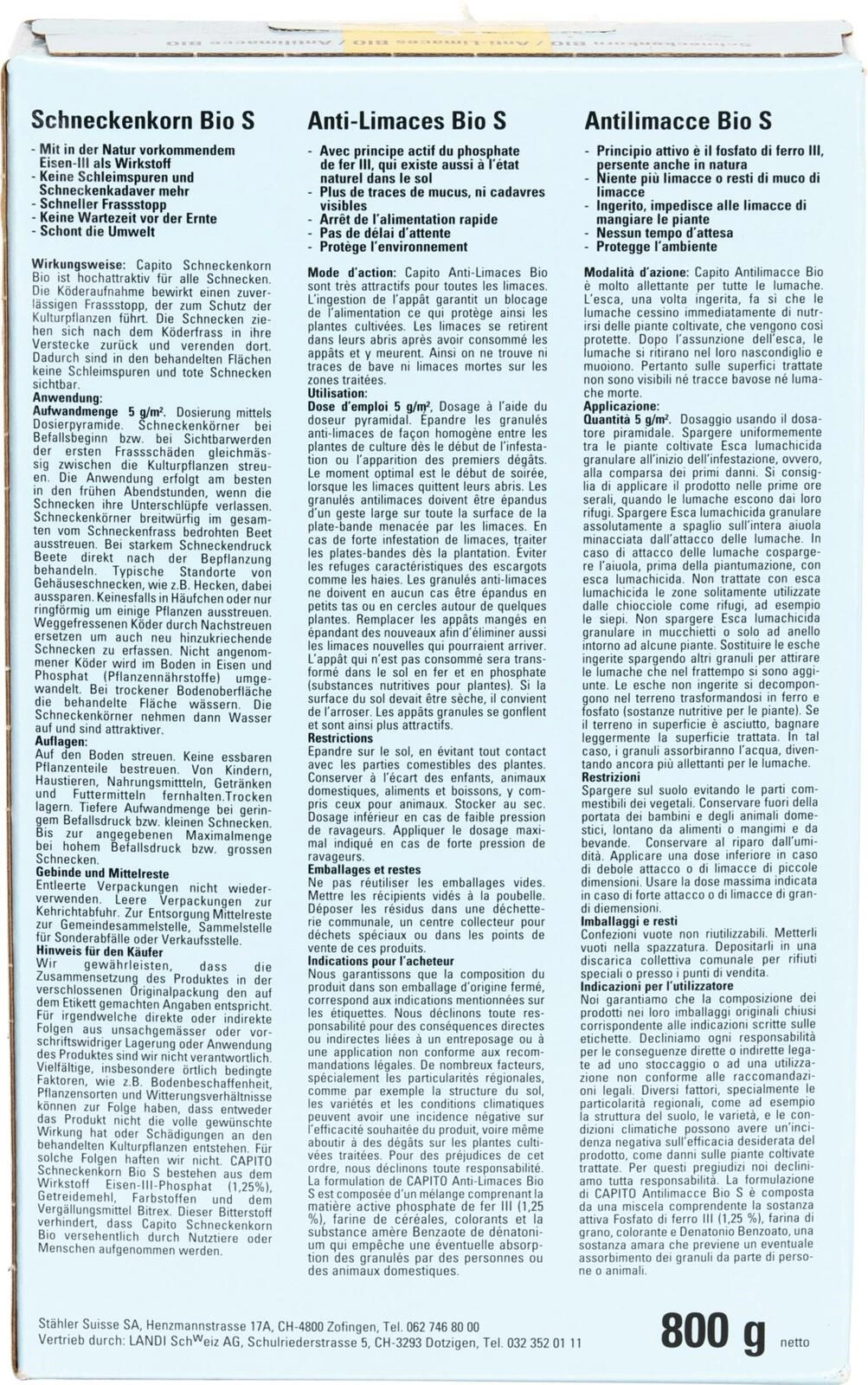 Hinweis für den Käufer: Wir gewährleisten, dass die Zusammensetzung des Produktes in der verschlossenen Originalpackung den auf dem Etikett gemachten Angaben entspricht. Für irgendwelche direkte oder indirekte Folgen aus unsachgemässer oder vorschriftswidriger Lagerung oder Anwendung des Produktes sind wir nicht verantwortlich. Vielfältige, insbesondere örtlich bedingte Faktoren, wie z.B. Bodenbeschaffenheit, Pflanzensorten und Witterungsverhältnisse können zur Folge haben, dass entweder das Produkt nicht die volle gewünschte Wirkung hat oder Schädigungen an den behandelten Kulturpflanzen entstehen. Für solche Folgen haften wir nicht. CAPITO Schneckenkorn Bio S bestehen aus dem Wirkstoff Eisen-III-Phosphat (1,25%), Getreidemehl, Farbstoffen und dem Vergällungsmittel Bitrex. Dieser Bitterstoff verhindert, dass Capito Schneckenkorn Bio versehentlich durch Nutztiere oder Menschen aufgenommen werden.