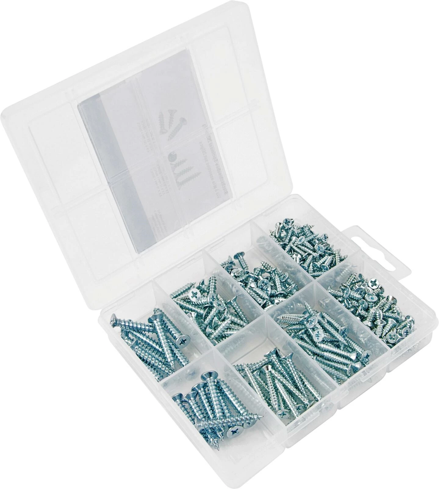 Das Schraubensortiment befindet sich in einer handlichen Kunststoffbox, darin enthalten sind folgende, verzinkte Blechschrauben mit Kreuzschlitz: 76 Stück 2,6 × 13 mm / 60 Stück 3,5 × 9,5 mm / 46 Stück 3,5 × 13 mm / 30 Stück 3,5 × 19 mm / 23 Stück 4,0 × 19 mm / 15 Stück 4,0 × 25 mm / 15 Stück 4,8 × 30 mm.
