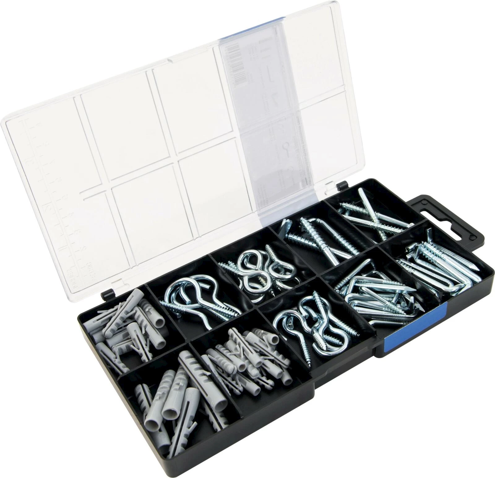 Sortimentskasten mit verzinkten Schraubhaken und mit Holzgewinde für vielseitige Befestigungen im Innen- und Aussenbereich. Korrosionsbeständig und langlebig.