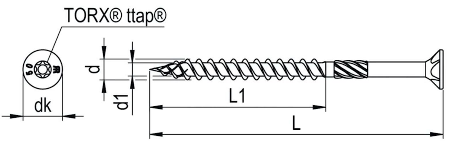 Flachsenkkopf. Verzinkt, blau passiviert. Teilgewinde. Antrieb: Torx. Norm: RN 9251. Masse: 5 × 120 mm.