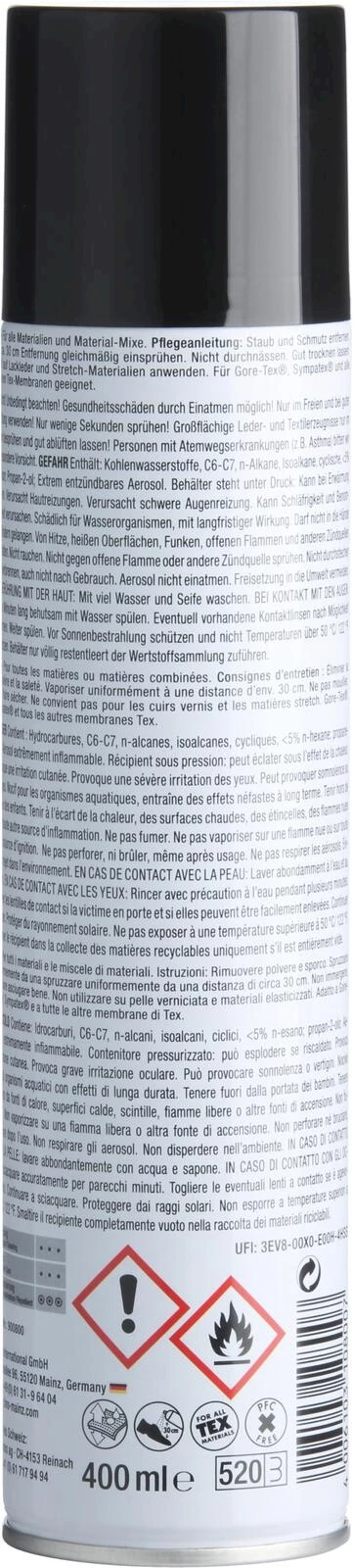 Für alle Materialien ausser Lackleder und Strech geeignet. Für Gore Tex®, Sympatex® und alle anderen Tex Membrane auch anwendbar.