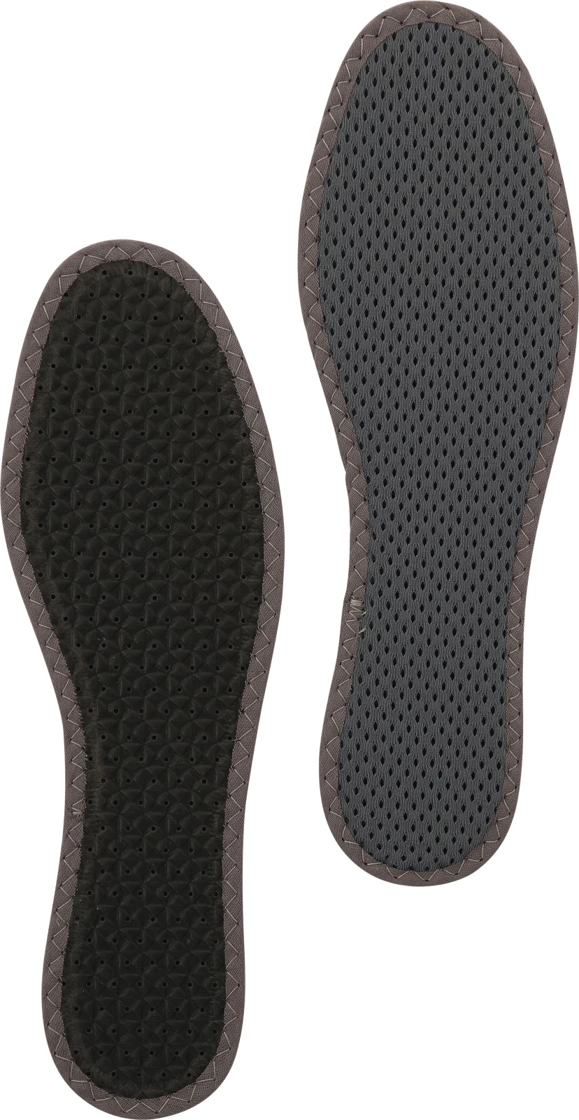 Polsternde luftdurchlässige Funktionsfaser. Aktivkohle-Vlies. Rutschsichere Aktivkohle-Latexschaum-Polsterung. Absorbiert in hohem Masse Fussgeruch. Sehr strapazierfähig. Polstert den Fuss beim Gehen und Stehen. Ist luftdurchlässig.