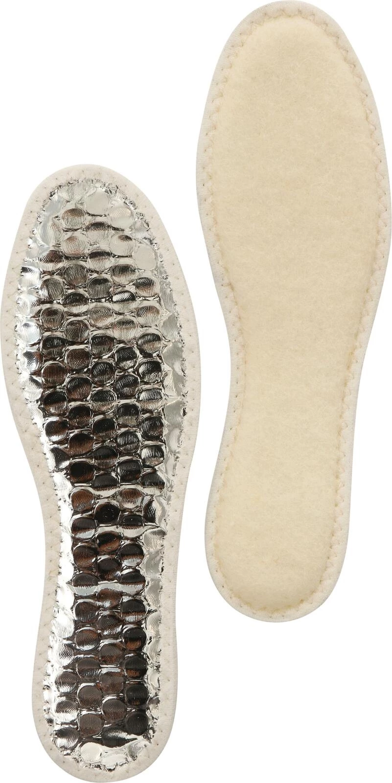 Wärmespeichernde, formstabile Sohle aus 100 % Wolle, mit Aluminiumschutzfolie und Anti-Rutsch-Beschichtung. Isoliert gegen Kälte, bindet Feuchtigkeit und ist langlebig.