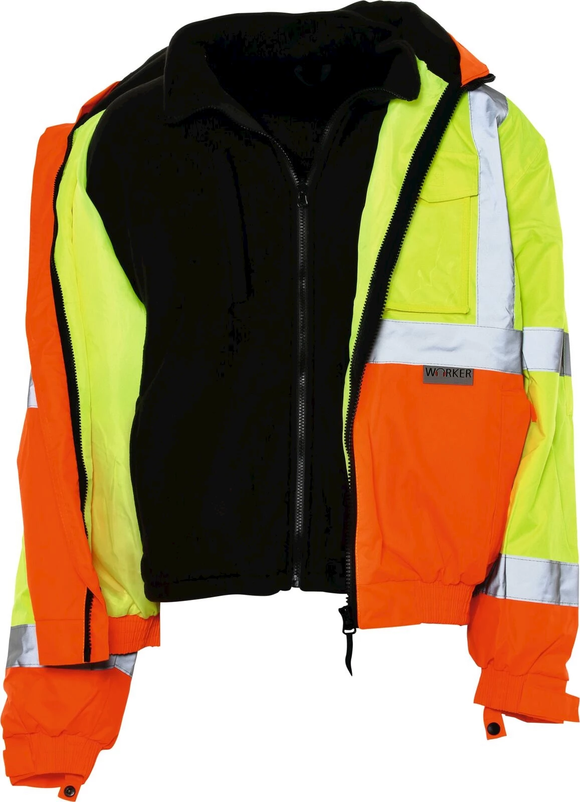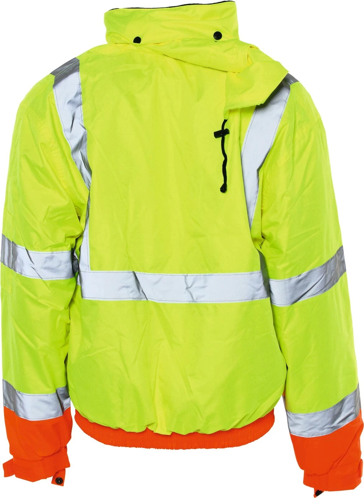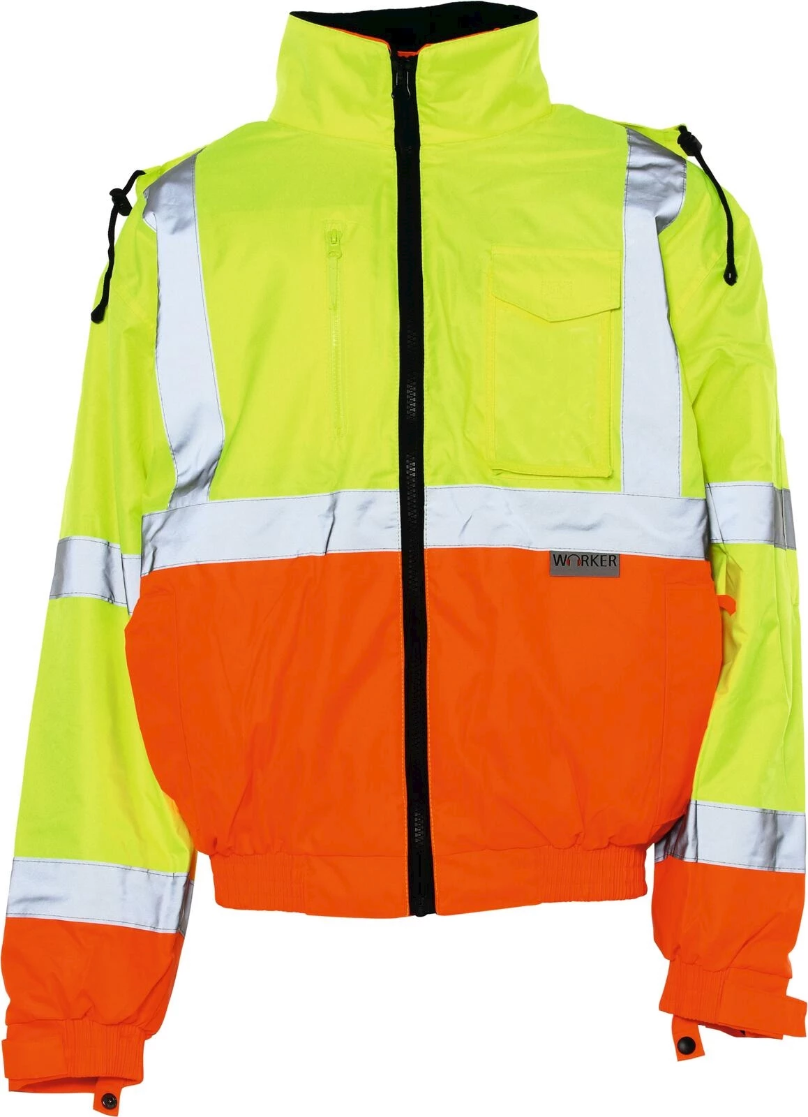 Wörker. Gefüttert. Wasserabweisend und winddicht. Mit verklebten Nähten und reflektierenden Leuchtstreifen. Material: Polyester. EN471 Klasse 3. Grössen: M - XXL.