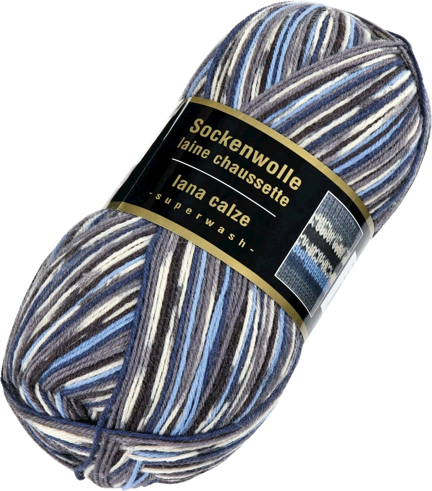 Die Sockenwolle eignet sich super zum Stricken von Socken. Die Wolle ist sehr angenehm auf der Haut und hält die Füsse schön warm. Hergestellt wird die Sockenwolle aus 75 % Schurwolle und 25 % Polyamid. Das Gewicht pro Knäuel beträgt 100 g. Farbe: blau/grau.