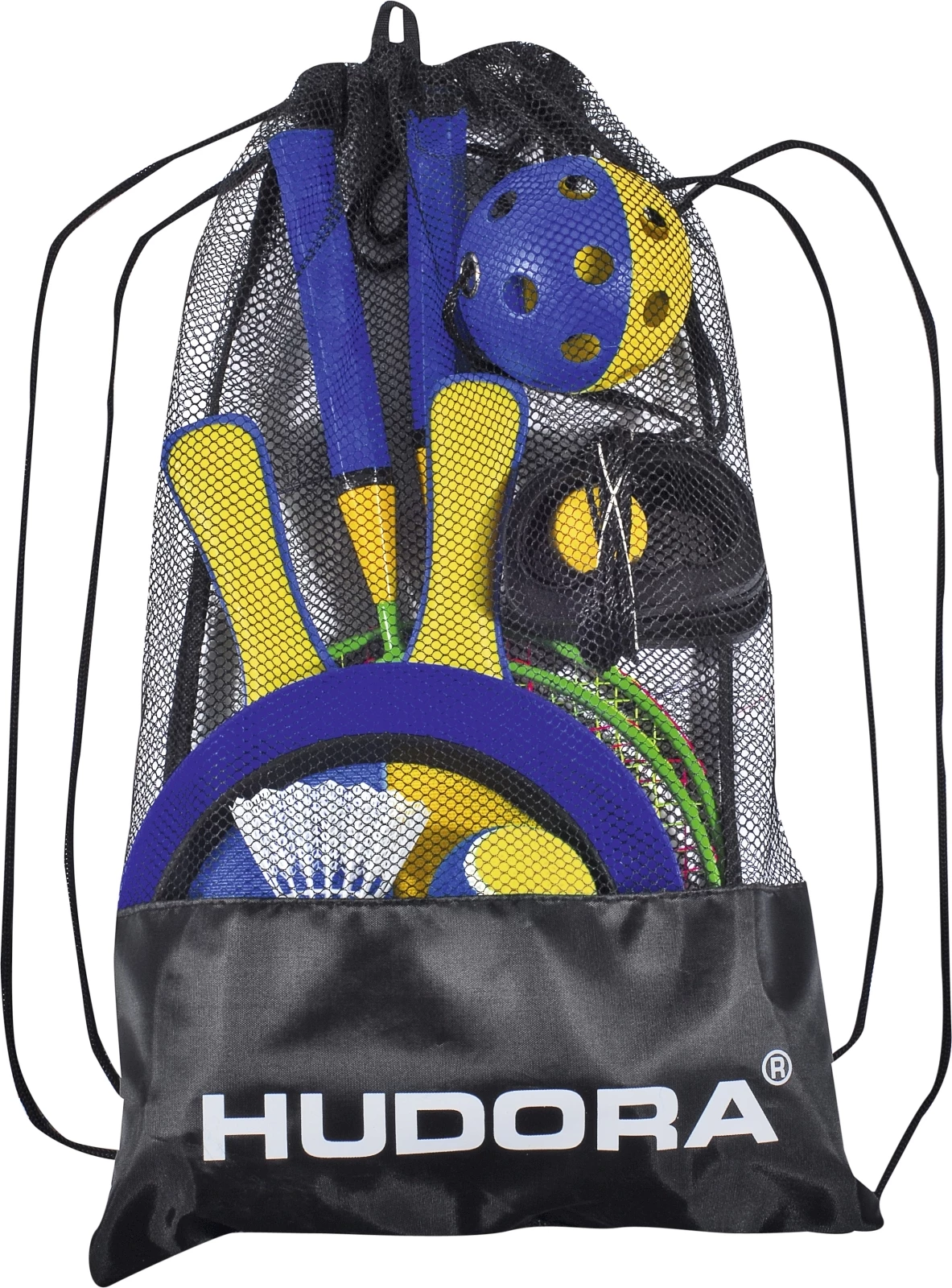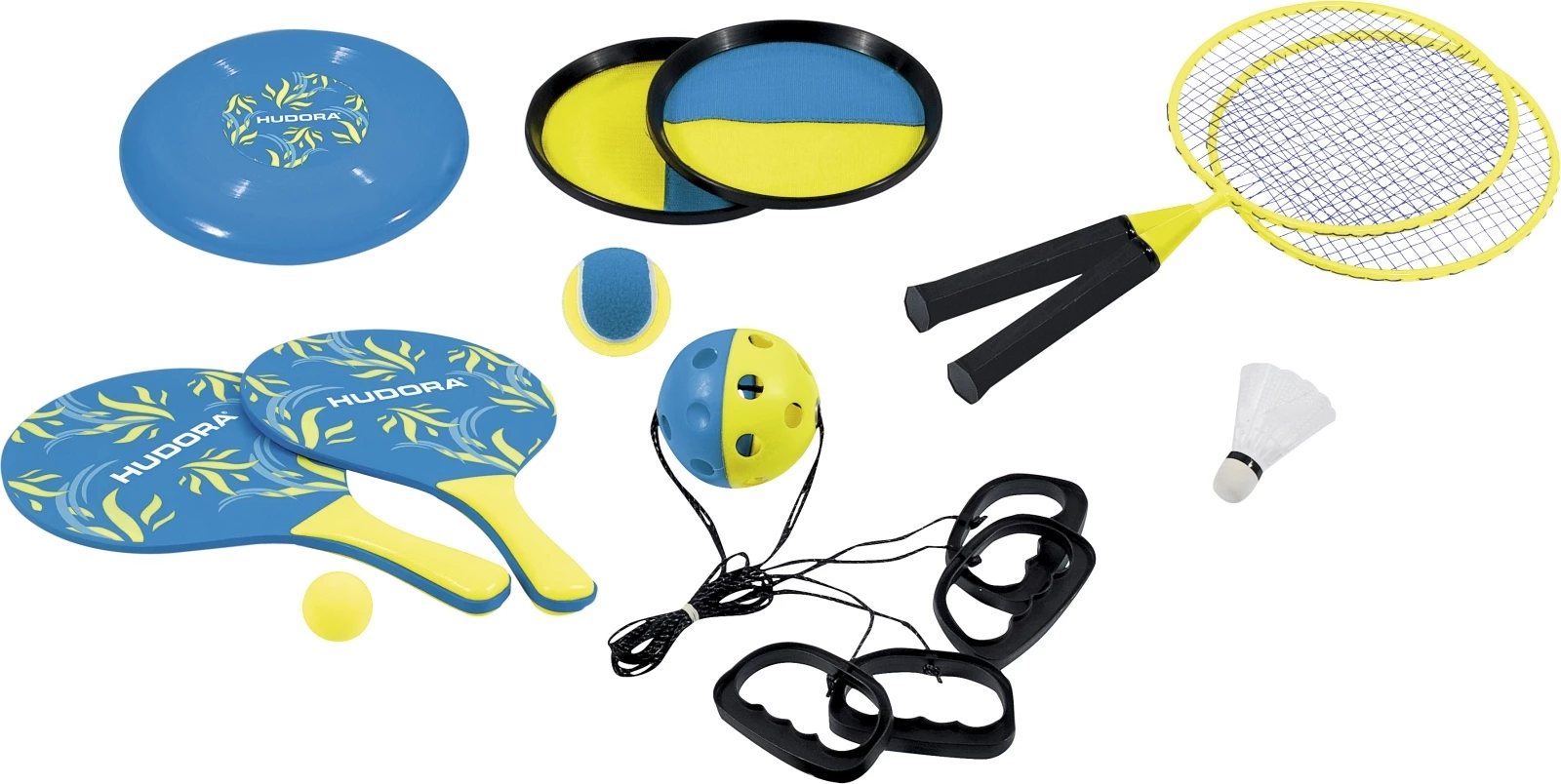 Im Set enthalten: 1 Mini-Badminton-Set, 1 Boing-Ball, 1 Beachball-Spiel, 1 Wurfscheibe und 1 Klettball-Spiel. Inkl. Tragtasche.
