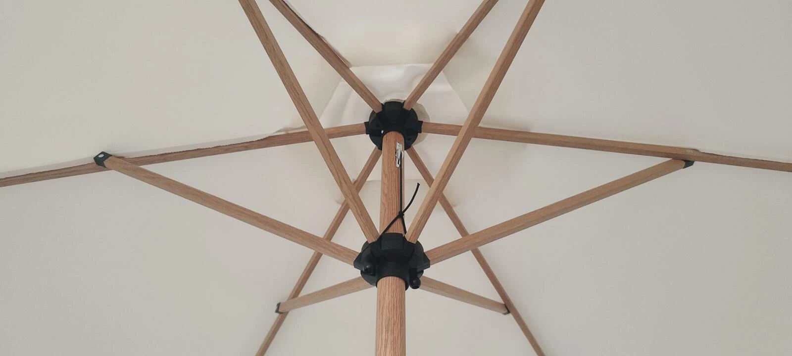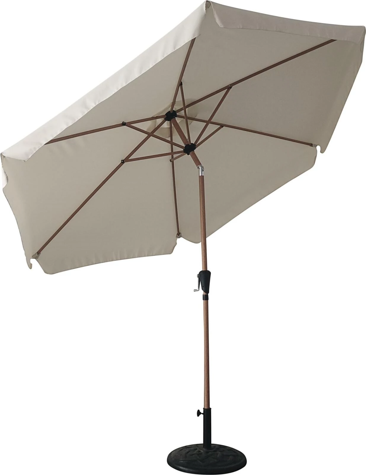 Material Gestänge: Alu. Material Stoff: Polyester. Bedienung mit Kurbel und Knickvorrichtung. Mit UV-Schutz 50+. Gesamthöhe: 243 cm. Ohne Sockel.