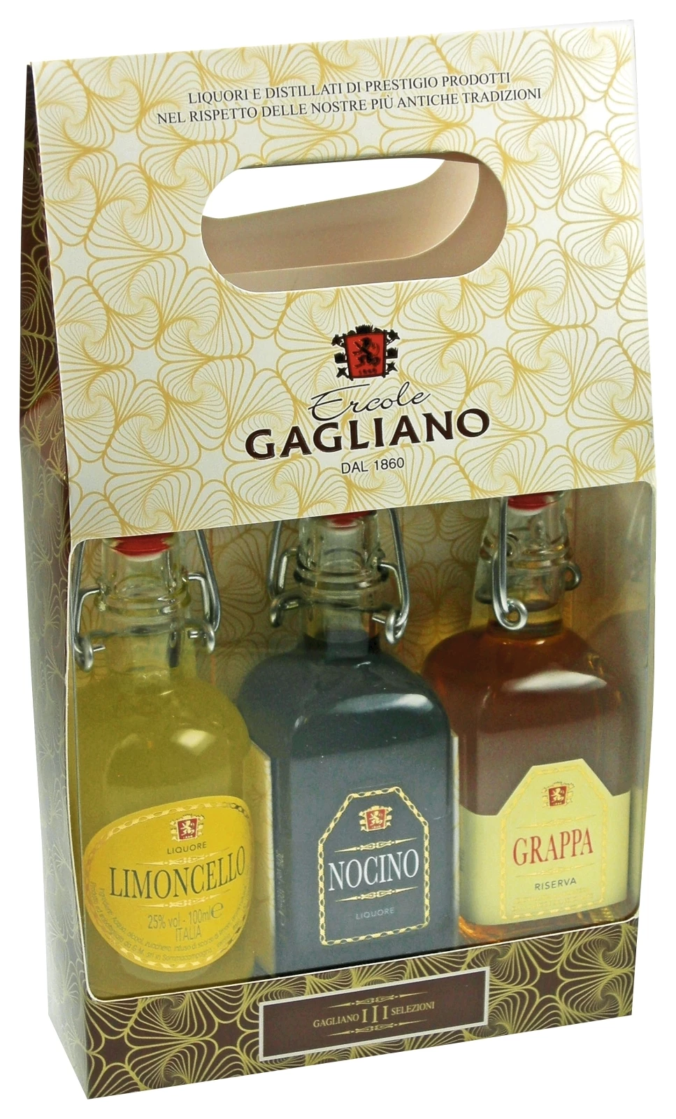 Drei Spezialitäten aus Italien vereinen sich in dieser Geschenkpackung. Limonecello, der vorzugsweise eiskalt getrunken wird, Nocino, ein Likör aus unreifen Baumnüssen und Grappa, der edle Begleiter zum Kaffee.