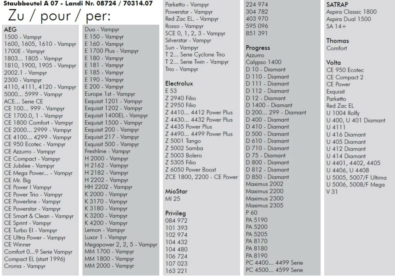 Der Staubbeutel A 07 ist mit diversen AEG, Electrolux und Progress Staubsaugern kompatibel. Durch den Vliesstoff im Innern des Beutels werden auch die kleinsten Staubpartikel gebunden. An der Kartonöffnung oben am Staubsaugersack befindet sich ein praktischer Schieber zu hygienischen Verschliessung.