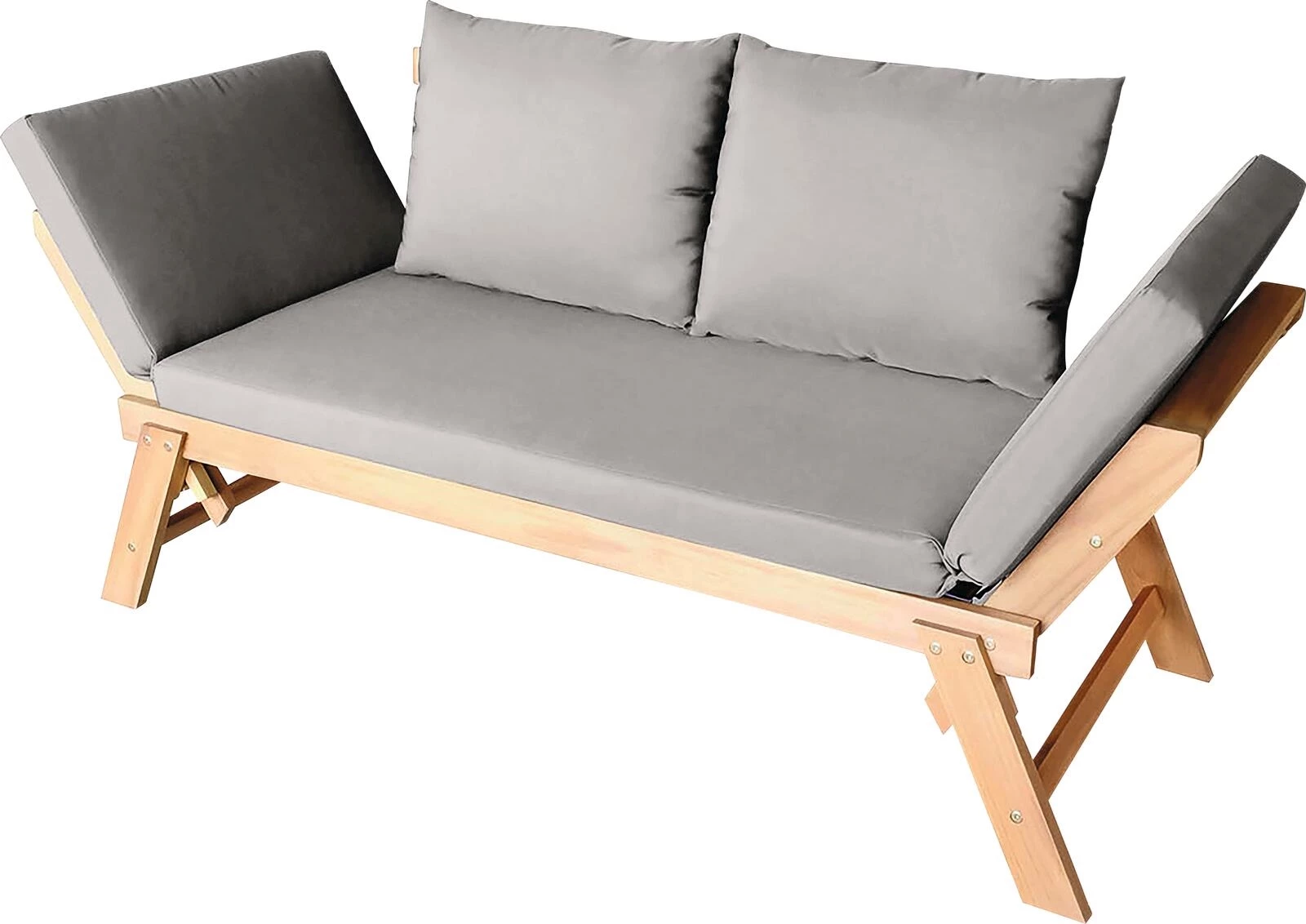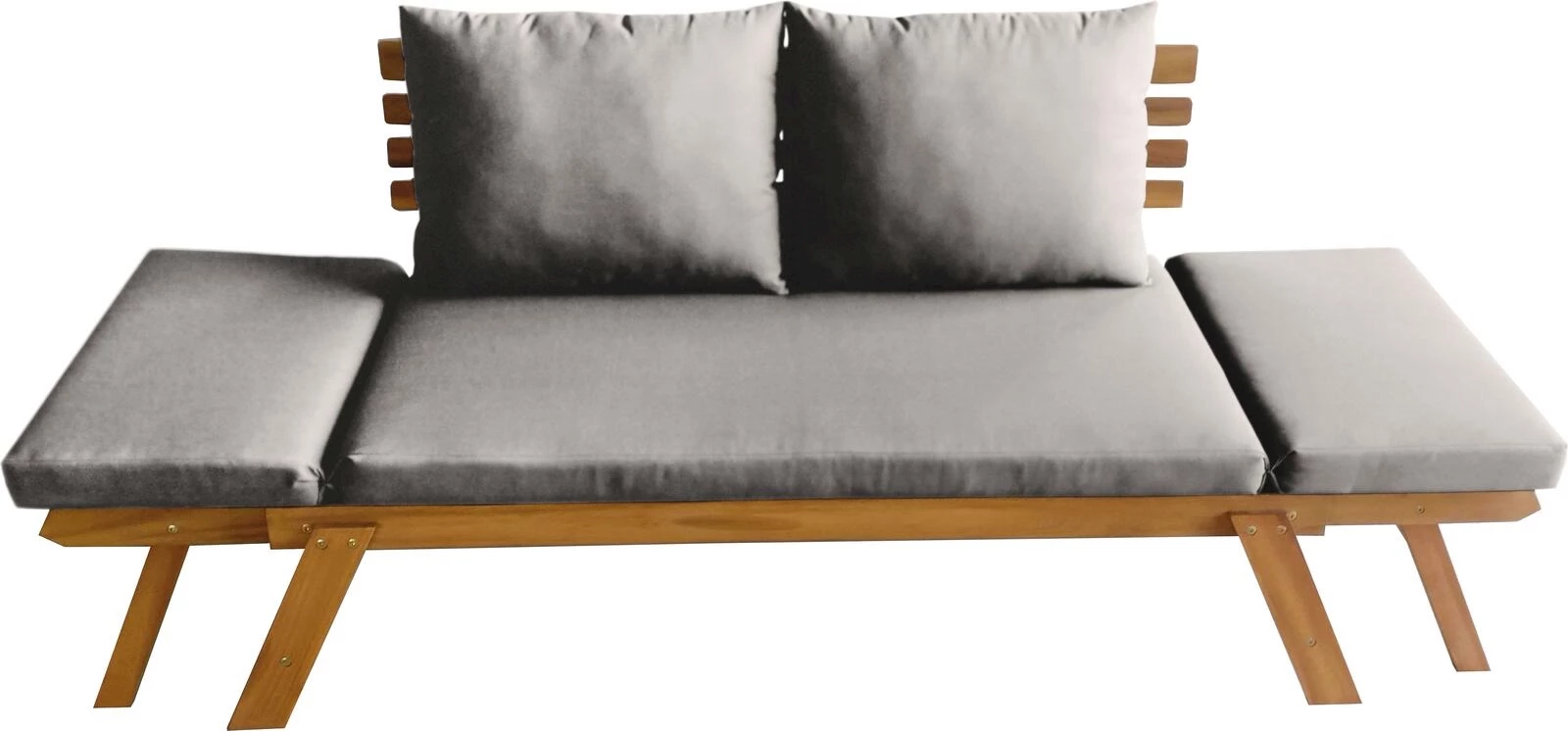 Als Bank oder Liege nutzbar. Witterungsbeständig. Maximale Tragkraft: 220 kg. Material Rahmen: Holz. Material Kissen: Polyester. Masse: Bank 166 × 70 × 75, Liege 196 × 70 × 75 cm. Unmontiert.