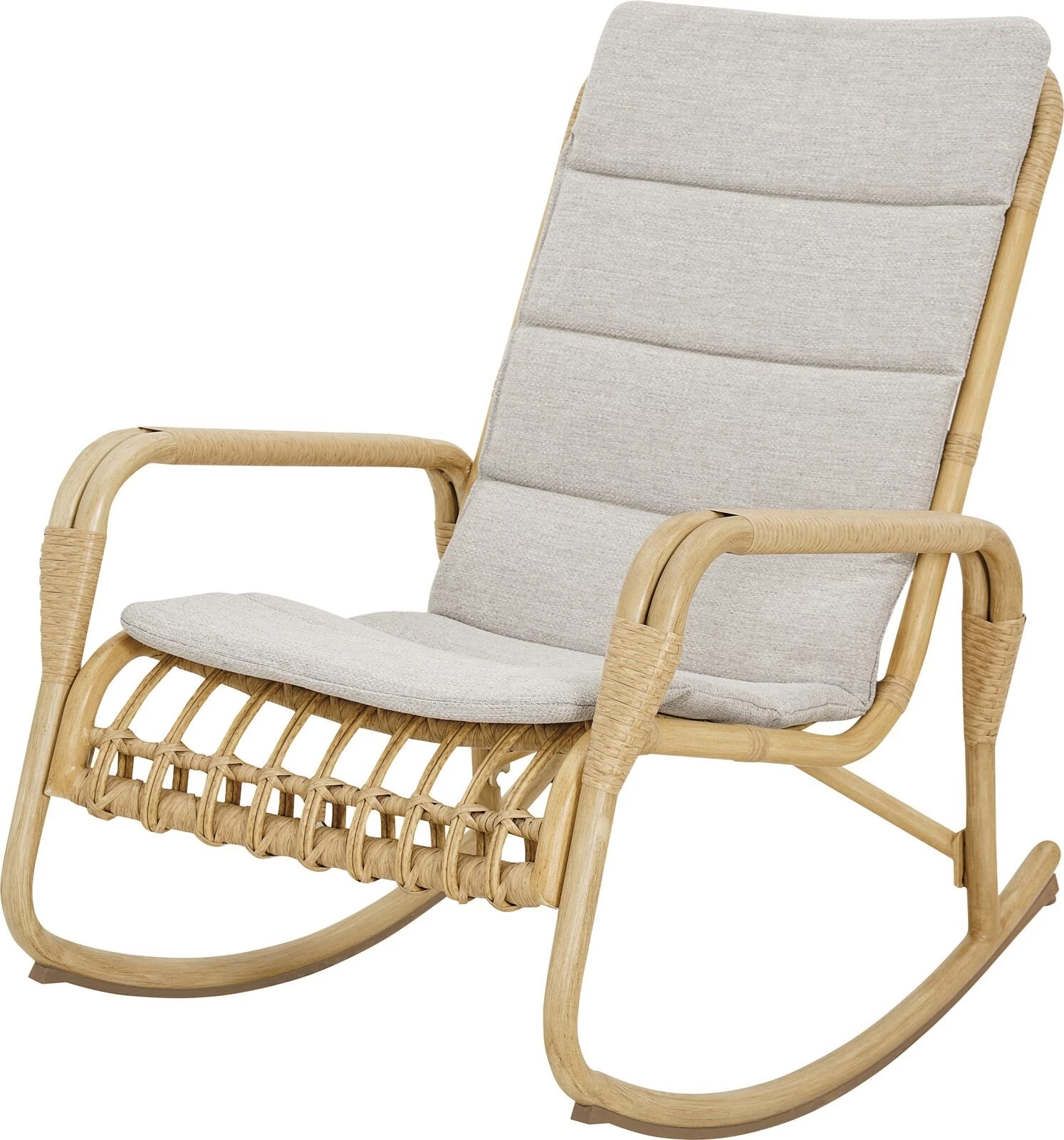 Dieser Schaukelstuhl besteht aus Rattan und Aluminium und bietet mit einer Kissenauflage hohen Komfort zum Wohlfühlen. Mit den Massen 70 × 98 × 93 cm und einer maximalen Tragkraft von 110 kg eignet er sich ideal für den Innenbereich oder den gedeckten Aussenbereich.