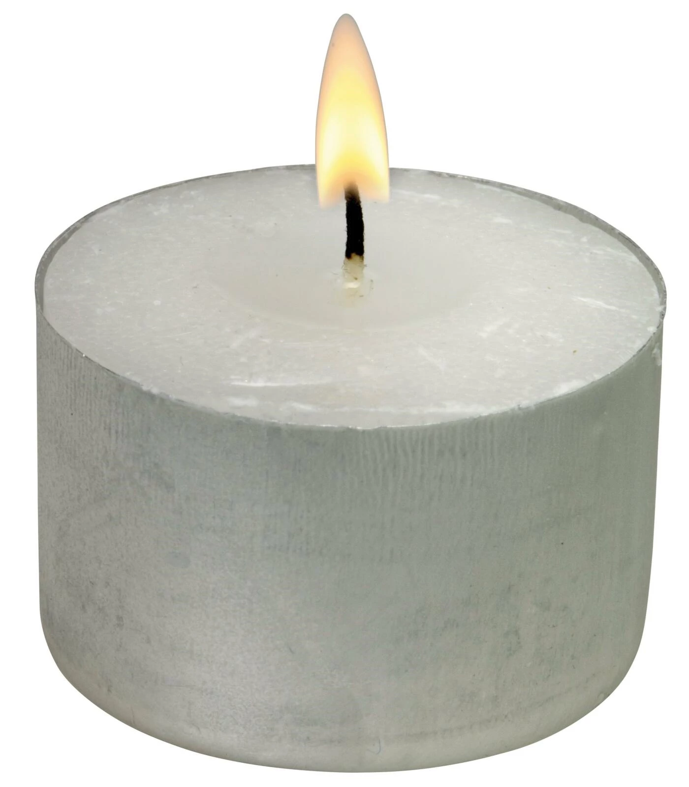 Die Teelichter haben eine Brenndauer von je ca. 8 Stunden und bestehen aus 100 % Paraffin. Ø: 38 mm, H: 24 mm.