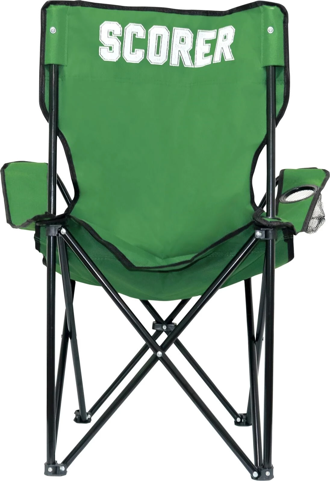 Klappbar. Mit Tragtasche und Halterung. Optimierter Sitzkomfort dank leicht schräger Rückenlehne. Aufschrift: Scorer.