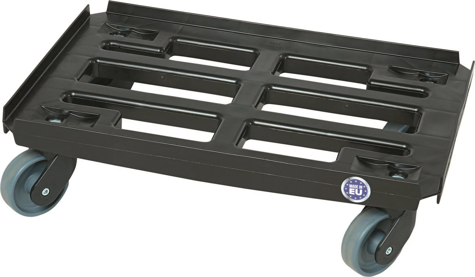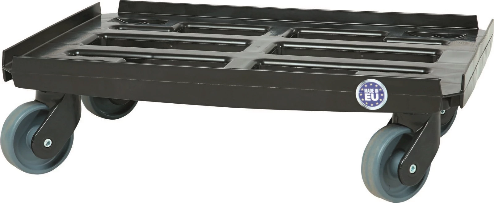 Transportroller aus hochwertigem schwarzem PP Kunststoff. 4 Lenkrollen. Rad: Ø 10 cm. Mit nach innen geparkten Rollen stapelbar.