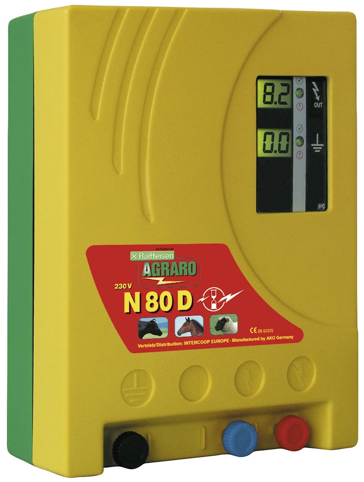 Der Viehhüter N80D TD Agraro mit schlagstarkem 230 Volt Netzgerät ist für verschiedene Bewuchse geeignet. Es kann zudem auch für Festzaunanlagen verwendet werden. Das Weidezaungerät ist für Pferde, Rinder, Schafe, Ziegen und zur Wildabwehr geeignet. Die zwei digital beleuchteten Displays zeigen die Ausgangs- und Erdspannung an und hat eine zusätzlich LED-Leuchte. Der Viehhüter ist zudem mit zwei Zaunausgängen (stark/schwach) ausgerüstet. Die eingebaute zeitverzögerte Anpassung der Schlagstärke bringt eine erhöhte Sicherheit für Mensch und Tier bei Zaunberührungen. Der Zaun wird permanent überwacht und löst bei Dauerberührungen einen Alarm aus und verlangsamt die Impulsfolge automatisch. Durch die AGRARO-Impulstechnik ist das Weidezaungerät deutlich sicherer, stromsparender und bei starkem Bewuchs durch extrem hohe Zaunspannungen wesentlich hütesicherer. Die Garantiedauer beträgt 5 Jahre.