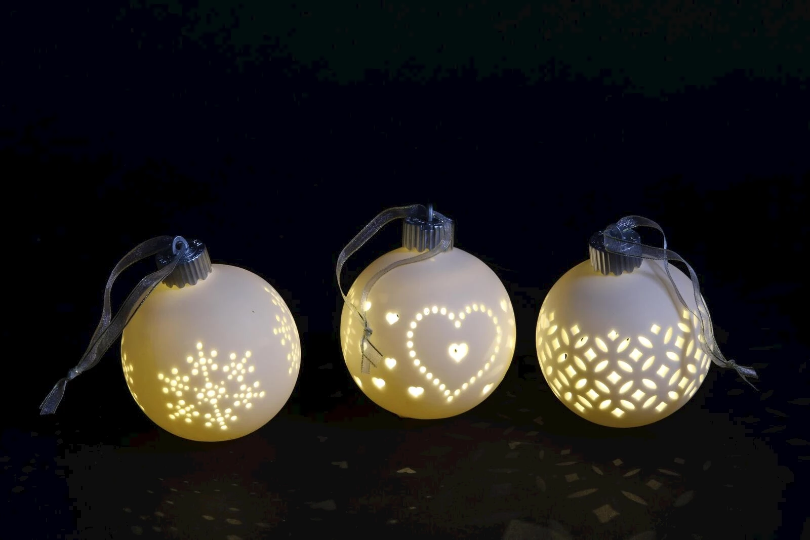 Dieses wunderschöne Porzellankugelset mit LED-Licht ist ein echter Blickfang in jedem Zuhause. Die kugelförmigen Lampen kommen im 3er-Set. Die Beleuchtung kann mit einem 6/18-Stunden-Timer eingestellt werden. In den elegant weissen Kugeln sind verschiedene Muster, durch welche das warmweisse Licht schimmert. Die benötigten 3 Stück LR44 Batterien sind im Lieferumfang enthalten.